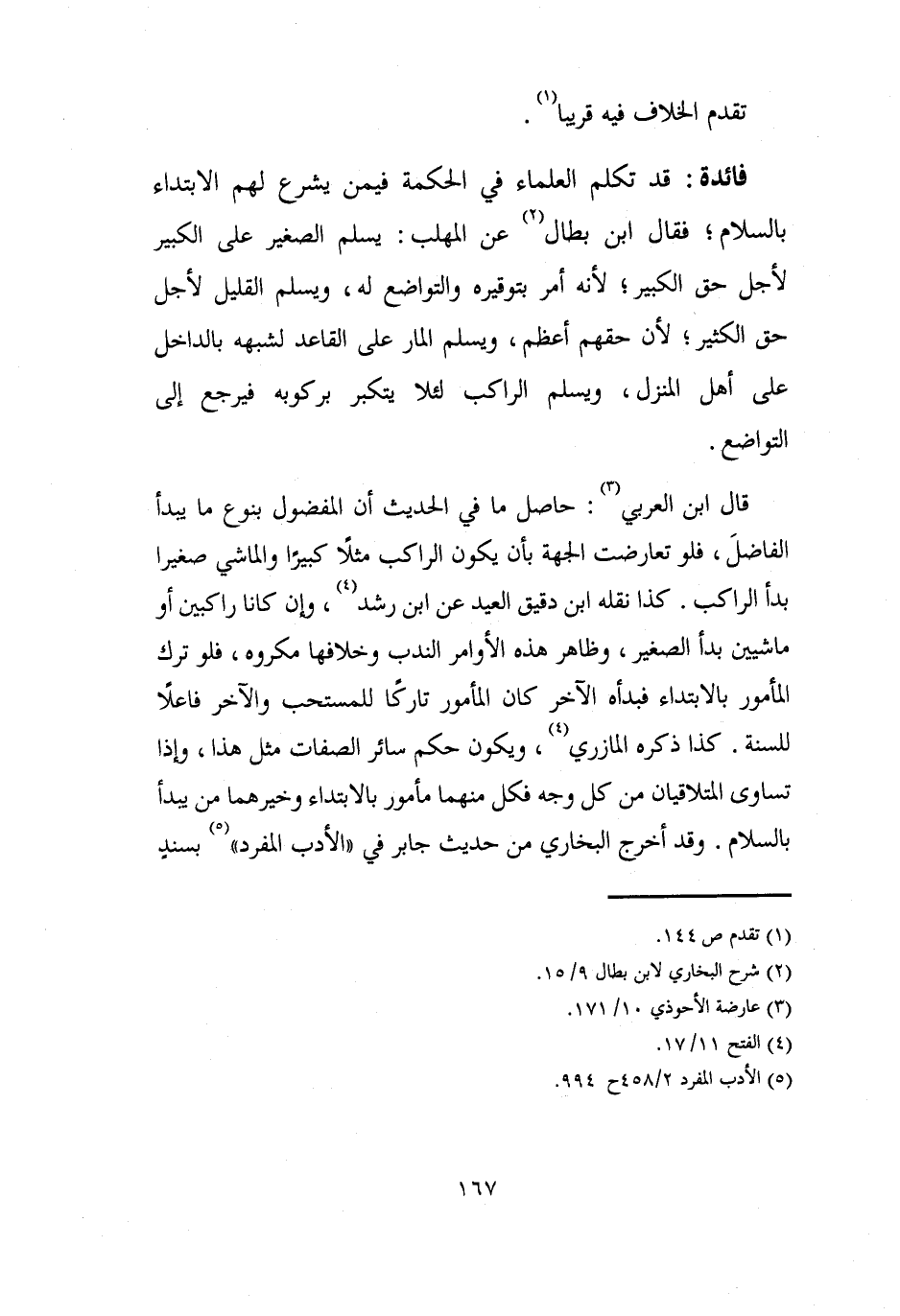 قال ابن العربي (¬3): حاصل ما في الحديث أن المفضول بنوع ما يبدأ الفاضلَ، فلو تعارضت الجهة بأن يكون الراكب مثلًا كبيرًا والماشي صغيرًا بدأ الراكب. كذا نقله ابن دقيق العيد عن ابن رشد (¬4)، وإن كانا راكبين أو ماشيين بدأ الصغير، وظاهر هذه الأوامر الندب وخلافها مكروه، فلو ترك المأمور بالابتداء فبدأه الآخر كان المأمور تاركًا للمستحب والآخر فاعلًا للسنة. كذا ذكره المازري (4)، ويكون حكم سائر الصفات مثل هذا، وإذا تساوى المتلاقيان من كل وجه فكل منهما مأمور بالابتداء وخيرهما من يبدأ بالسلام. وقد أخرج البخاري من حديث جابر في "الأدب المفرد" (¬5) بسندٍ