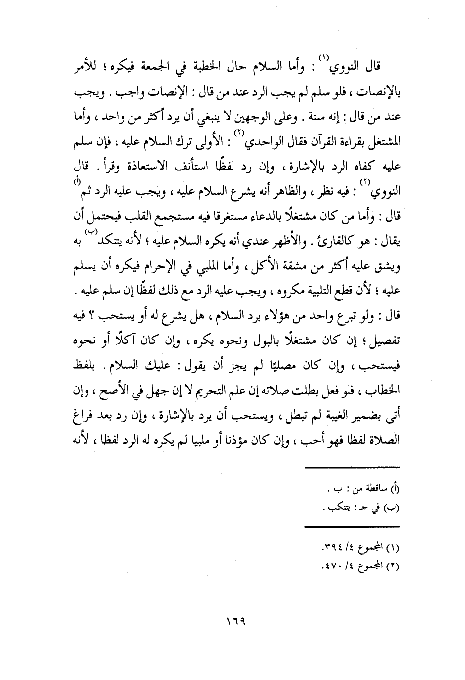 قال النووي (¬1): وأما السلام حال الخطبة في الجمعة فيكره؛ للأمر بالإنصات، فلو سلم لم يجب الرد عند من قال: الإنصات واجب. ويجب عند من قال: إنه سنة. وعلى الوجهين لا ينبغي أن يرد أكثر من واحد، وأما المشتغل بقراءة القرآن فقال الواحدي (¬2): الأولى ترك السلام عليه، فإن سلم عليه كفاه الرد بالإشارة، وإن رد لفظا استأنف الاستعاذة وقرأ. قال النووي (2): فيه نظر، والظاهر أنه يشرع السلام عليه، ويجب عليه الرد ثم (أ) قال: وأما من كان مشتغلًا بالدعاء مستغرقا فيه مستجمع القلب فيحتمل أن يقال: هو كالقارئ. والأظهر عندي أنه يكره السلام عليه؛ لأنه يتنكد (ب) به ويشق عليه أكثر من مشقة الأكل، وأما الملبي في الإحرام فيكره أن يسلم عليه؛ لأن قطع التلبية مكروه، ويجب عليه الرد مع ذلك لفظًا إن سلم عليه. قال: ولو تبرع واحد من هؤلاء برد السلام، هل يشرع له أو يستحب؟ فيه تفصيل؛ إن كان مشتغلًا بالبول ونحوه يكره، وإن كان آكلًا أو نحوه فيستحب، وإن كان مصليًا لم يجز أن يقول: عليك السلام. بلفظ الخطاب، فلو فعل بطلت صلاته إن علم التحريم لا إن جهل في الأصح، وإن أتى بضمير الغيبة لم تبطل، ويستحب أن يرد بالإشارة، وإن رد بعد فراغ الصلاة لفظا فهو أحب، وإن كان مؤذنا أو ملبيا لم يكره له الرد لفظا، لأنه