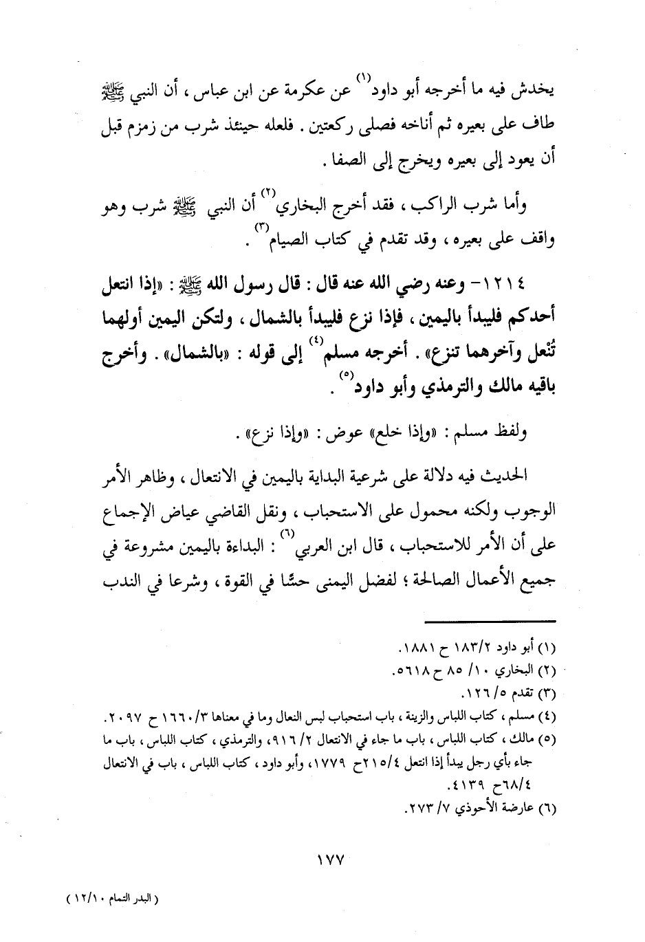 (¬5) مالك، كتاب اللباس، باب ما جاء في الانتعال 2/ 916، والترمذي، كتاب اللباس، باب ما جاء بأي رجل يبدأ إذا انتعل 4/ 215 ح 1779، وأبو داود، كتاب اللباس، باب في الانتعال 4/ 68 ح 4139.
