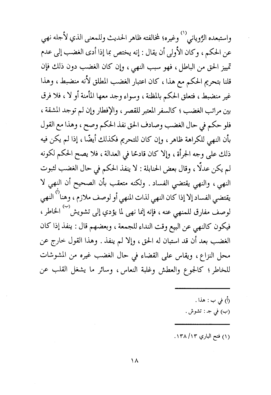 واستبعده الرُّوياني (¬1) وغيره؛ لمخالفته ظاهر الحديث وللمعنى الذي لأجله نهي عن الحكم، وكان الأولى أن يقال: إنه يختص بما إذا أدى الغضب إلى عدم تمييز الحق من الباطل، فهو سبب النهي، وإن كان الغضب دون ذلك فإن قلنا بتحريم الحكم مع هذا، كان اعتبار الغضب المطلق لأنه منضبط، وهذا غير منضبط، فتعلق الحكم بالمظنة، وسواء وجد معها المأمنة أو لا، فلا فرق بين مراتب الغضب؛ كالسفر المعتبر للقصر، والإفطار وإن لم توجد المشقة، فلو حكم في حال الغضب وصادف الحق نفذ الحكم وصح، وهذا مع القول بأن النهي للكراهة ظاهر، وإن كان للتحريم فكذلك أيضًا، إذا لم يكن فيه ذلك على وجه الجرأة، وإلا كان قادحًا في العدالة، فلا يصح الحكم لكونه لم يكن عدلًا، وقال بعض الحنابلة: لا ينفذ الحكم في حال الغضب لثبوت النهي، والنهي يقتضي الفساد. ولكنه متعقب بأن الصحيح أن النهي لا يقتضي الفساد إلا إذا كان النهي لذات المنهي أو لوصف ملازم، وهنا (أ) النهي لوصف مفارق للمنهي عنه، فإنه إنما نهى لما يؤدي إلى تشويش (ب) الخاطر، فيكون كالنهي عن البيع وقت النداء للجمعة، وبعضهم قال: ينفذ إذا كان الغضب بعد أن قد استبان له الحق، وإلا لم ينفذ. وهذا القول خارج عن محل النزاع، ويقاس على القضاء في حال الغضب غيره من المشوشات للخاطر؛ كالجوع والعطش وغلبة النعاس، وسائر ما يشغل القلب عن