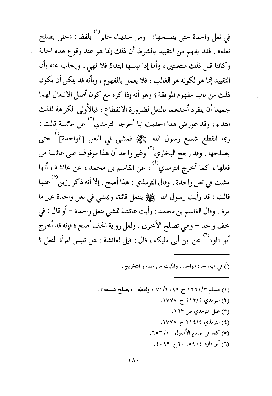 في نعل واحدة حتى يصلحها". ومن حديث جابر (¬1) بلفظ: "حتى يصلح نعله". فقد يفهم من التقييد بالشرط أن ذلك إنما هو عند وقوع هذه الحالة وكانتا قبل ذلك منتعلتين، وأما إذا لبسها ابتداءً فلا نهي. ويجاب عنه بأن التقييد إنما هو لكونه هو الغالب، فلا يعمل بالمفهوم، وبأنه قد يمكن أن يكون ذلك من باب مفهوم الموافقة؛ وهو أنه إذا كره مع كون أصل الانتعال لهما جميعا أن ينفرد أحدهما بالنعل لضرورة الانقطاع، فبالأولى الكراهة لذلك ابتداء، وقد عورض هذا الحديث بما أخرجه الترمذي (¬2) عن عائشة قالت: ربما انقطع شسع رسول الله - صلى الله عليه وسلم - فمشى في النعل [الواحدة] (أ) حتى يصلحها. وقد رجح البخاري (¬3) وغير واحد أن هذا موقوف على عائشة من فعلها، كما أخرج الترمذي (¬4)، عن القاسم بن محمد، عن عائشة، أنها مشت في نعل واحدة. وقال الترمذي: هذا أصح. إلا أنه ذكر رزين (¬5) عنها قالت: قد رأيت رسول الله - صلى الله عليه وسلم - ينتعل قائمًا ويمشي في نعل واحدة غير ما مرة. وقال القاسم بن محمد: رأيت عائشة تمشي بنعل واحدة -أو قال: في خف واحد- وهي تصلح الأخرى. ولعل رواية الخف أصح؛ فإنه قد أخرج أبو داود (¬6) عن ابن أبي مليكة، قال: قيل لعائشة: هل تلبس المرأة النعل؟