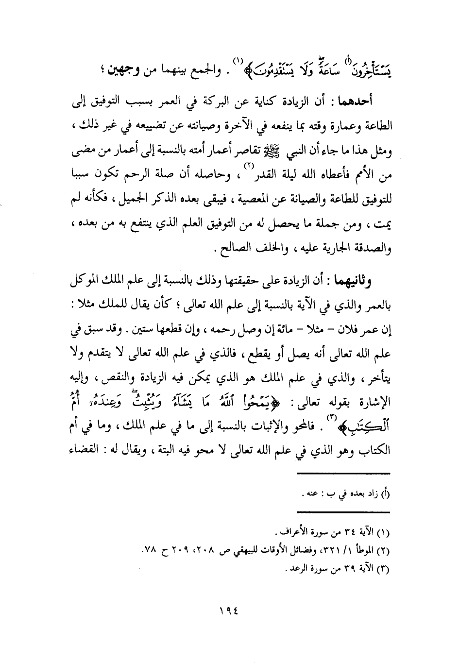 وثانيهما: أن الزيادة على حقيقتها وذلك بالنسبة إلى علم الملك الموكل بالعمر والذي في الآية بالنسبة إلى علم الله تعالى؛ كأن يقال للملك مثلًا: إن عمر فلان -مثلًا- ماثة إن وصل رحمه، وإن قطعها ستين. وقد سبق في علم الله تعالى أنه يصل أو يقطع، فالذي في علم الله تعالى لا يتقدم ولا يتأخر، والذي في علم الملك هو الذي يمكن فيه الزيادة والنقص، وإليه الإشارة بقوله تعالى: {يَمْحُو اللَّهُ مَا يَشَاءُ وَيُثْبِتُ وَعِنْدَهُ أُمُّ الْكِتَابِ} (¬3). فالمحو والإثبات بالنسبة إلى ما في علم الملك، وما في أم الكتاب وهو الذي في علم الله تعالى لا محو فيه البتة، ويقال له: القضاء