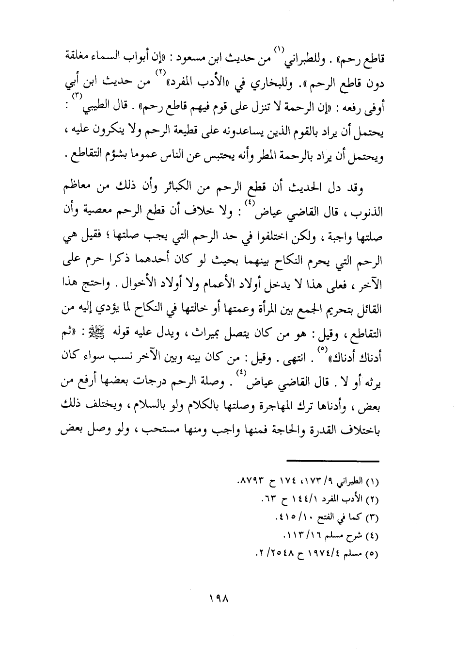 وقد دل الحديث أن قطع الرحم من الكبائر وأن ذلك من معاظم الذنوب، قال القاضي عياض (¬4): ولا خلاف أن قطع الرحم معصية وأن صلتها واجبة، ولكن اختلفوا في حد الرحم التي يجب صلتها؛ فقيل هي الرحم التي يحرم النكاح بينهما بحيث لو كان أحدهما ذكرا حرم على الآخر، فعلى هذا لا يدخل أولاد الأعمام ولا أولاد الأخوال. واحتج هذا القائل بتحريم الجمع بين المرأة وعمتها أو خالتها في النكاح لا يؤدي إليه من التقاطع، وقيل: هو من كان يتصل بميراث، ويدل عليه قوله - صلى الله عليه وسلم -: "ثم أدناك أدناك" (¬5). انتهى. وقيل: من كان بينه وبين الآخر نسب سواء كان يرثه أو لا. قال القاضي عياض (4). وصلة الرحم درجات بعضها أرفع من بعض، وأدناها ترك المهاجرة وصلتها بالكلام ولو بالسلام، ويختلف ذلك باختلاف القدرة والحاجة فمنها واجب ومنها مستحب، ولو وصل بعض