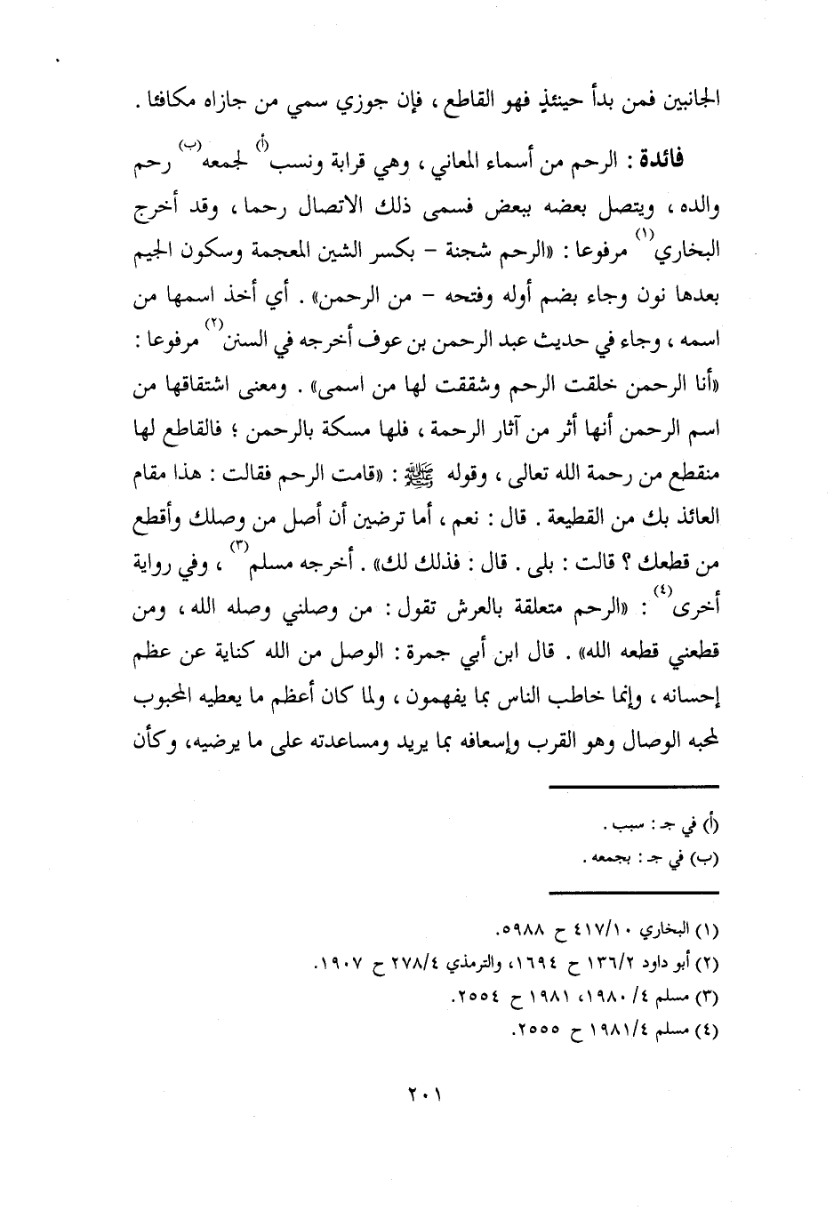 فائدة: الرحم من أسماء المعاني، وهي قرابة ونسب (أ) لجمعه (ب) رحم والده، ويتصل بعضه ببعض فسمى ذلك الاتصال رحما، وقد أخرج البخاري (¬1) مرفوعًا: "الرحم شجنة -بكسر الشين المعجمة وسكون الجيم بعدها نون وجاء بضم أوله وفتحه- من الرحمن". أي أخذ اسمها من اسمه، وجاء في حديث عبد الرحمن بن عوف أخرجه في السنن (¬2) مرفوعًا: "أنا الرحمن خلقت الرحم وشققت لها من اسمى". ومعنى اشتقاقها من اسم الرحمن أنها أثر من آثار الرحمة، فلها مسكة بالرحمن، فالقاطع لها منقطع من رحمة الله تعالى، وقوله - صلى الله عليه وسلم -: "قامت الرحم فقالت: هذا مقام العائذ بك من القطيعة. قال: نعم، أما ترضين أن أصل من وصلك وأقطع من قطعك؟ قالت: بلى. قال: فذلك لك". أخرجه مسلم (¬3)، وفي رواية أخرى (¬4): "الرحم متعلقة بالعرش تقول: من وصلني وصله الله، ومن قطعني قطعه الله". قال ابن أبي جمرة: الوصل من الله كناية عن عظم إحسانه، وإنما خاطب الناس بما يفهمون، ولما كان أعظم ما يعطيه المحبوب لمحبه الوصال وهو القرب وإسعافه بما يريد ومساعدته على ما يرضيه، وكأن