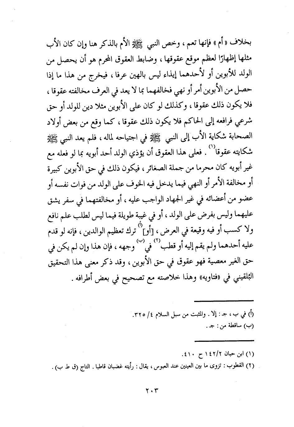 بخلاف "أم" فإنها تعم، وخص النبي - صلى الله عليه وسلم - الأم بالذكر هنا وإن كان الأب مثلها إظهارًا لعظم موقع عقوقها، وضابط العقوق المحرم هو أن يحصل من الولد للأبوين أو لأحدهما إيذاء ليس بالهين عرفا، فيخرج من هذا ما إذا حصل من الأبوين أمر أو نهي فخالفهما بما لا يعد في العرف مخالفته عقوقا، فلا يكون ذلك عقوقا، وكذلك لو كان على الأبوين مثلًا دين للولد أو حق شرعي فرافعه إلى الحاكم فلا يكون ذلك عقوقا، كما وقع من بعض أولاد الصحابة شكاية الأب إلى النبي - صلى الله عليه وسلم - في اجتياحه لماله، فلم يعد النبي - صلى الله عليه وسلم - شكايته عقوقا (¬1). فعلى هذا العقوق أن يؤذي الولد أحد أبويه بما لو فعله مع غير أبويه كان محرما من جملة الصغائر، فيكون ذلك في حق الأبوين كبيرة أو مخالفة الأمر أو النهي فيما يدخل فيه الخوف على الولد من فوات نفسه أو عضو من أعضائه في غير الجهاد الواجب عليه، أو مخالفتهما في سفر يشق عليهما وليس بفرض على الولد، أو في غيبة طويلة فيما ليس لطلب علم نافع ولا كسب أو فيه وقيعة في العرض، [أو] (أ) ترك تعطم الوالدين، فإنه لو قدم عليه أحدهما ولم يقم إليه أو قطب (¬2) في (ب) وجهه، فإن هذا وإن لم يكن في حق الغير معصية فهو عقوق في حق الأبوين، وقد ذكر معنى هذا التحقيق البُلقيني في "فتاويه" وهذا خلاصته مع تصحيح في بعض أطرافه.