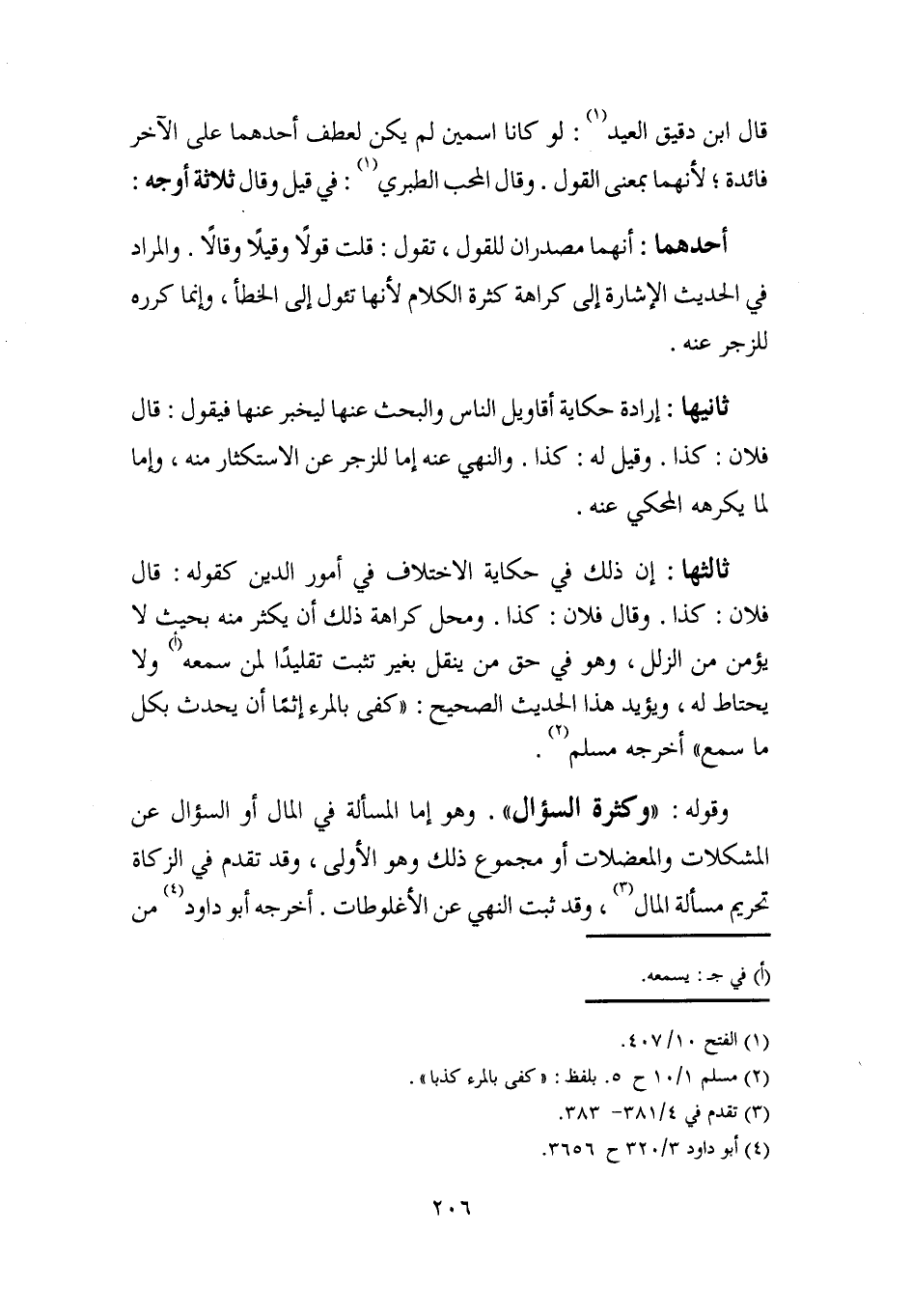 ثالثها: إن ذلك في حكاية الاختلاف في أمور الدين كقوله: قال فلان: كذا. وقال فلان: كذا. ومحل كراهة ذلك أن يكثر منه بحيث لا يؤمن من الزلل، وهو في حق من ينقل بغير تثبت تقليدًا لمن سمعه (أ) ولا يحتاط له، ويؤيد هذا الحديث الصحيح: "كفى بالمرء إثمًا أن يحدث بكل ما سمع" أخرجه مسلم (¬2).