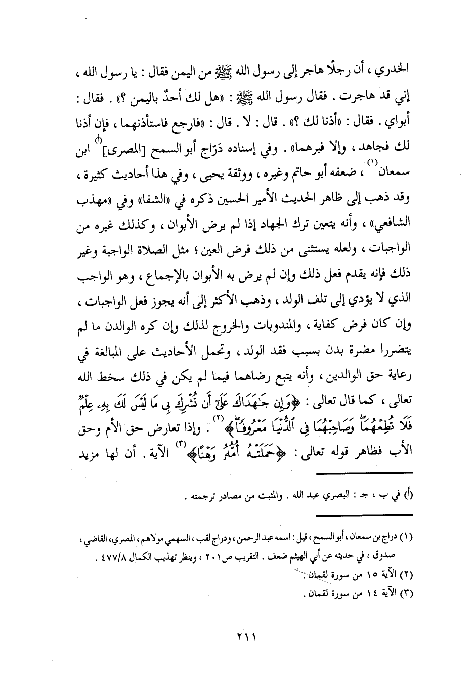 الخدري، أن رجلًا هاجر إلى رسول الله - صلى الله عليه وسلم - من اليمن فقال: يا رسول الله، إني قد هاجرت. فقال رسول الله - صلى الله عليه وسلم -: "هل لك أحدٌ باليمن؟ ". فقال: أبواي. فقال: "أذنا لك؟ ". قال: لا. قال: "فارجع فاستأذنهما، فإن أذنا لك فجاهد، وإلا فبرهما". وفي إسناده دَرّاج أبو السمح [المصرى] (أ) ابن سمعان (¬1)، ضعفه أبو حاتم وغيره، ووثقة يحيى، وفي هذا أحاديث كثيرة، وقد ذهب إلى ظاهر الحديث الأمير الحسين ذكره في "الشفا" وفي "مهذب الشافعي"، وأنه يتعين ترك الجهاد إذا لم يرض الأبوان، وكذلك غيره من الواجبات، ولعله يستثنى من ذلك فرض العين؛ مثل الصلاة الواجبة وغير ذلك فإنه يقدم فعل ذلك وإن لم يرض به الأبوان بالإجماع، وهو الواجب الذي لا يؤدي إلى تلف الولد، وذهب الأكثر إلى أنه يجوز فعل الواجبات، وإن كان فرض كفاية، والمندوبات والخروج لذلك وإن كره الوالدن ما لم يتضررا مضرة بدن بسبب فقد الولد، وتحمل الأحاديث على المبالغة في رعاية حق الوالدين، وأنه يتبع رضاهما فيما لم يكن في ذلك سخط الله تعالى، كما قال تعالى: {وَإِنْ جَاهَدَاكَ عَلَى أَنْ تُشْرِكَ بِي مَا لَيْسَ لَكَ بِهِ عِلْمٌ فَلَا تُطِعْهُمَا وَصَاحِبْهُمَا فِي الدُّنْيَا مَعْرُوفًا} (¬2). وإذا تعارض حق الأم وحق الأب فظاهر قوله تعالى: {حَمَلَتْهُ أُمُّهُ وَهْنًا} (¬3) الآية. أن لها مزيد