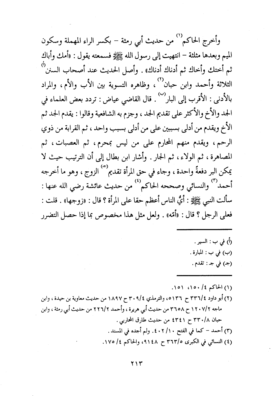 وأخرج الحاكم (¬1) من حديث أبي رمثة -بكسر الراء المهملة وسكون الميم وبعدها مثلثة- انتهيت إلى رسول الله - صلى الله عليه وسلم - فسمعته يقول: "أمك وأباك ثم أختك وأخاك ثم أدناك أدناك". وأصل الحديث عند أصحاب السنن (أ) الثلاثة وأحمد وابن حبان (¬2)، وظاهره التسوية بين الأب والأم، والمراد بالأدنى: الأقرب إلى البار (ب). قال القاضي عياض: تردد بعض العلماء في الجد والأخ والأكثر على تقديم الجد، وجزم به الشافعية وقالوا: يقدم الجد ثم الأخ ويقدم من أدلى بسببين على من أدلى بسبب واحد، ثم القرابة من ذوي الرحم، ويقدم منهم المحارم على من ليس بمحرم، ثم العصبات، ثم المصاهرة، ثم الولاء، ثم الجار. وأشار ابن بطال إلى أن الترتيب حيث لا يمكن البر دفعةً واحدة، وجاء في حق المرأة تقديم (جـ) الزوج، وهو ما أخرجه أحمد (¬3) والنسائي وصححه الحاكم (¬4) من حديث عائشة رضي الله عنها: سألت النبي - صلى الله عليه وسلم -: أيُّ الناس أعظم حقا على المرأة؟ قال: "زوجها". قلت: فعلى الرجل؟ قال: "أمّه". ولعل مثل هذا مخصوص بما إذا حصل التضرر