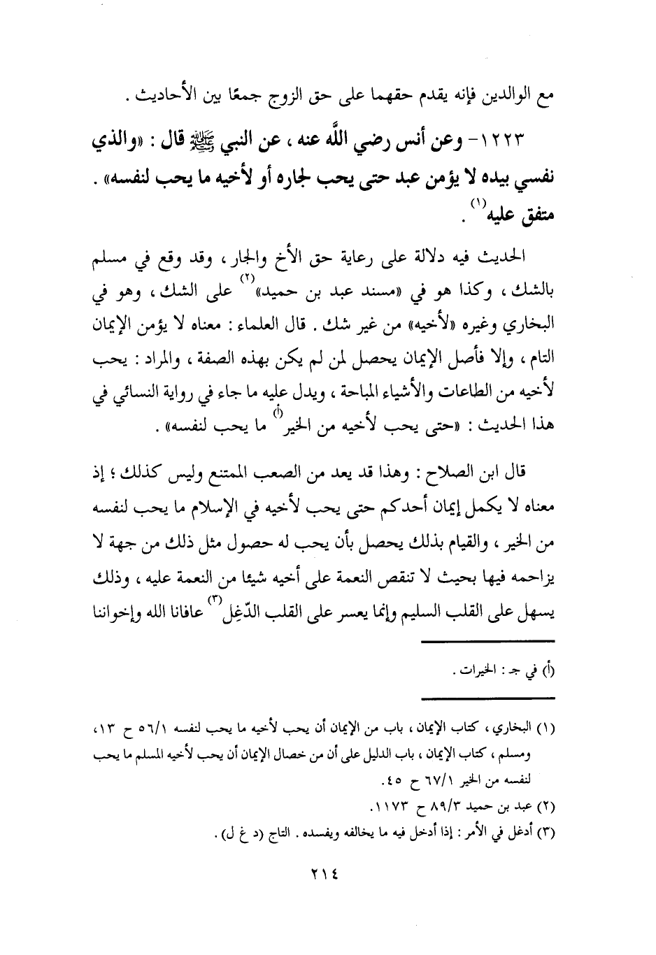 (¬1) البخاري، كتاب الإيمان، باب من الإيمان أن يحب لأخيه ما يحب لنفسه 1/ 56 ح 13، ومسلم، كتاب الإيمان، باب الدليل على أن من خصال الإيمان أن يحب لأخيه المسلم ما يحب لنفسه من الخير 1/ 67 ح 45.