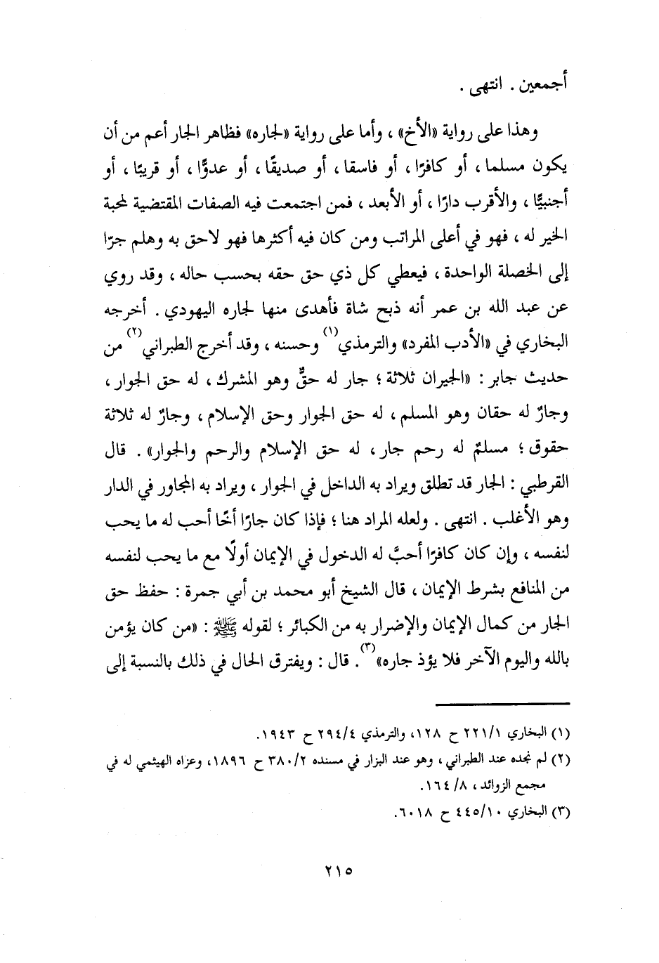 وهذا على رواية "الأخ"، وأما على رواية "لجاره" فظاهر الجار أعم من أن يكون مسلما، أو كافرًا، أو فاسقا، أو صديقًا، أو عدوًّا، أو قريبًا، أو أجنبيًّا، والأقرب دارًا، أو الأبعد، فمن اجتمعت فيه الصفات المقتضية لمحبة الخير له، فهو في أعلى المراتب ومن كان فيه أكثرها فهو لاحق به وهلم جرّا إلى الخصلة الواحدة، فيعطي كل ذي حق حقه بحسب حاله، وقد روي عن عبد الله بن عمر أنه ذبح شاة فأهدى منها لجاره اليهودي. أخرجه البخاري في "الأدب المفرد" والترمذي (¬1) وحسنه، وقد أخرج الطبراني (¬2) من حديث جابر: "الجيران ثلاثة؛ جار له حقٌّ وهو المشرك، له حق الجوار، وجارٌ له حقان وهو المسلم، له حق الجوار وحق الإسلام، وجارٌ له ثلاثة حقوق؛ مسلمٌ له رحم جار، له حق الإسلام والرحم والجوار". قال القرطبي: الجار قد تطلق ويراد به الداخل في الجوار، ويراد به المجاور في الدار وهو الأغلب. انتهى. ولعله المراد هنا؛ فإذا كان جارًا أخًا أحب له ما يحب لنفسه، وإن كان كافرًا أحبَّ له الدخول في الإيمان أولًا مع ما يحب لنفسه من المنافع بشرط الإيمان، قال الشيخ أبو محمد بن أبي جمرة: حفظ حق الجار من كمال الإيمان والإضرار به من الكبائر؛ لقوله - صلى الله عليه وسلم -: "من كان يؤمن بالله واليوم الآخر فلا يؤذ جاره" (¬3). قال: ويفترق الحال في ذلك بالنسبة إلى