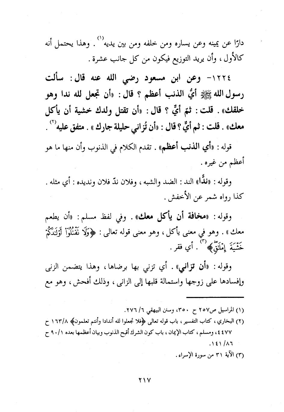 1224 - وعن ابن مسعود رضي الله عنه قال: سألت رسول الله - صلى الله عليه وسلم - أيُّ الذنب أعظم؟ قال: "أن تجعل لله ندا وهو خلقك". قلت: ثمّ أيٌّ؟ قال: "أن تقتل ولدك خشية أن يأكل معك". قلت: ثم أيٌّ؟ قال: "أن تُزاني حليلة جارك". متفق عليه (¬2).