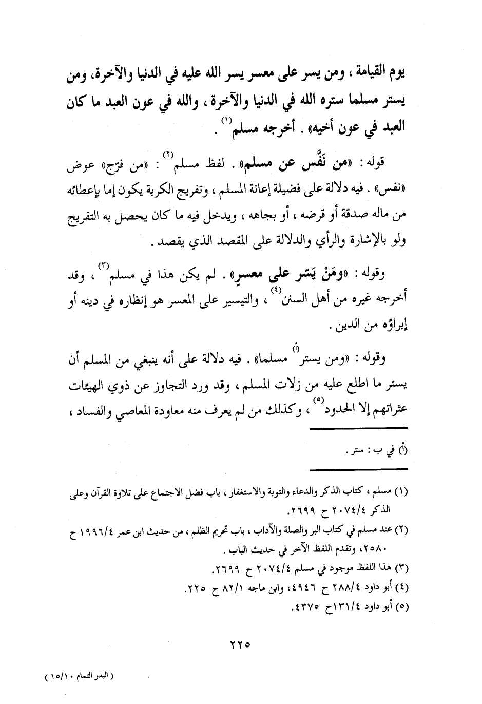 يوم القيامة، ومن يسر على معسر يسر الله عليه في الدنيا والآخرة، ومن يستر مسلما ستره الله في الدنيا والآخرة، والله في عون العبد ما كان العبد في عون أخيه". أخرجه مسلم (¬1).
