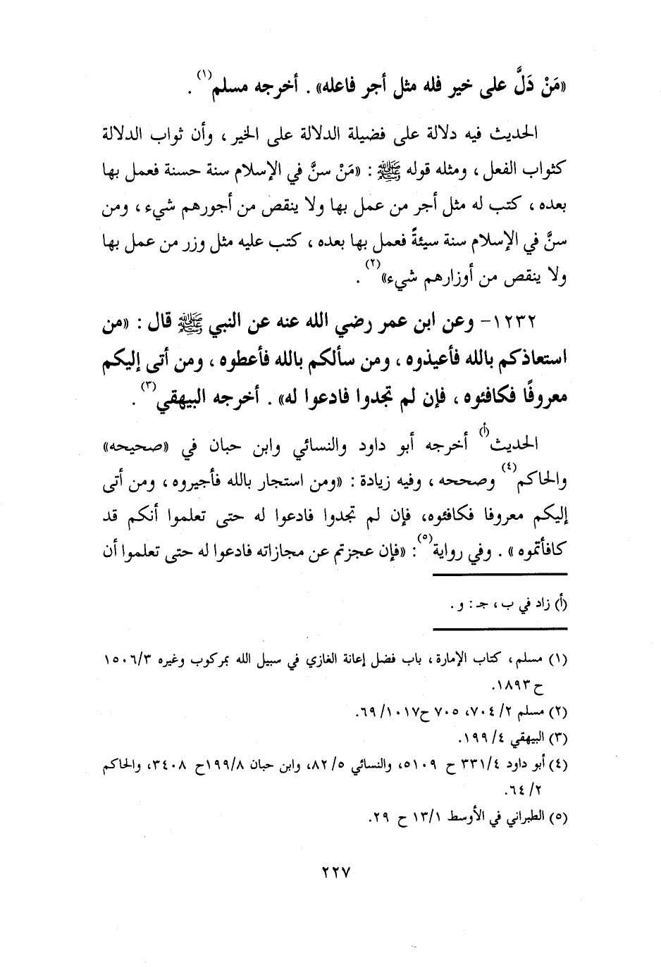 1232 - وعن ابن عمر رضي الله عنه عن النبي - صلى الله عليه وسلم - قال: "من استعاذكم بالله فأعيذوه، ومن سألكم بالله فأعطوه، ومن أتى إليكم معروفًا فكافئوه، فإن لم تجدوا فادعوا له". أخرجه البيهقي (¬3).