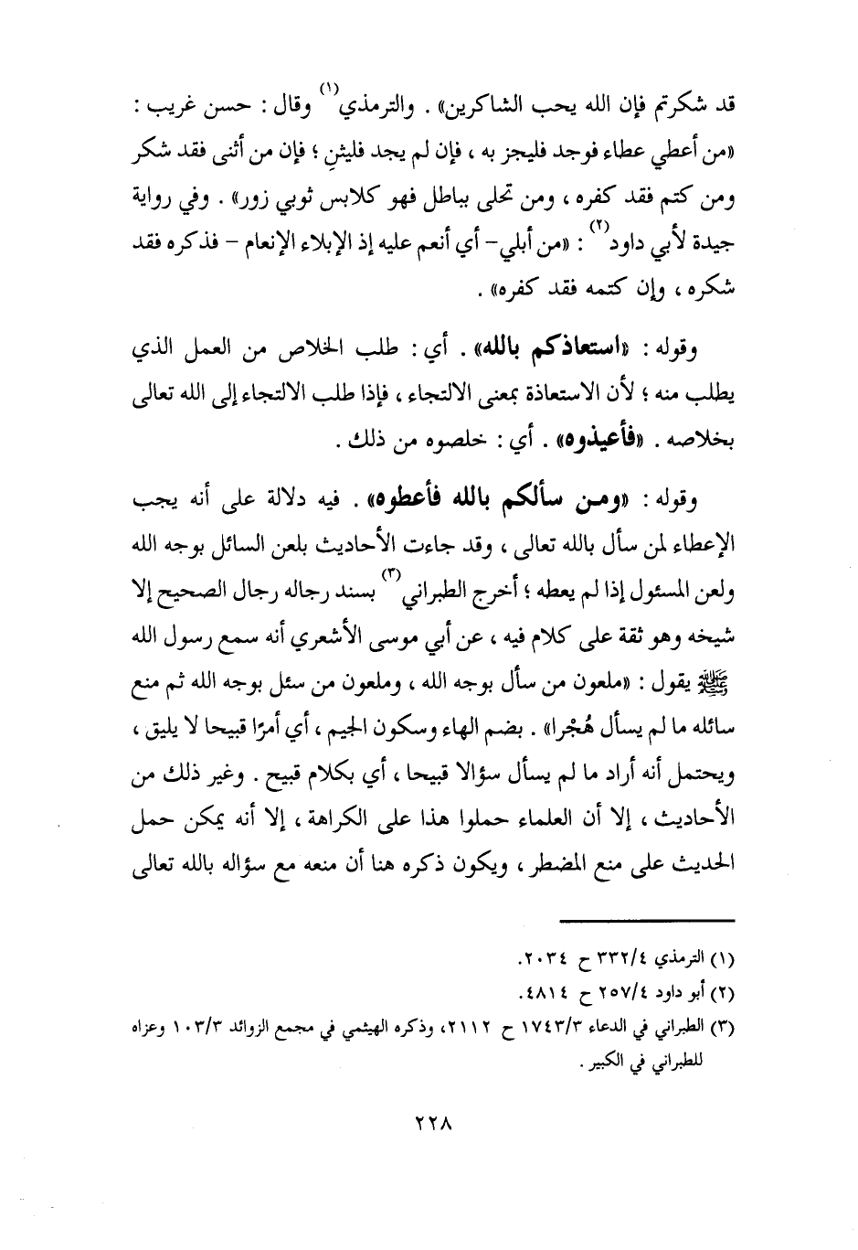 وقوله: "ومن سألكم بالله فأعطوه". فيه دلالة على أنه يجب الإعطاء لمن سأل بالله تعالى، وقد جاءت الأحاديث بلعن السائل بوجه الله ولعن المسئول إذا لم يعطه؛ أخرج الطبراني (¬3) بسند رجاله رجال الصحيح إلا شيخه وهو ثقة على كلام فيه، عن أبي موسى الأشعري أنه سمع رسول الله - صلى الله عليه وسلم - يقول: "ملعون من سأل بوجه الله، وملعون من سئل بوجه الله ثم منع سائله ما لم يسأل هُجْرا". بضم الهاء وسكون الجيم، أي أمرًا قبيحا لا يليق، ويحتمل أنه أراد ما لم يسأل سؤالا قبيحا، أي بكلام قبيح. وغير ذلك من الأحاديث، إلا أن العلماء حملوا هذا على الكراهة، إلا أنه يمكن حمل الحديث على منع المضطر، ويكون ذكره هنا أن منعه مع سؤاله بالله تعالى