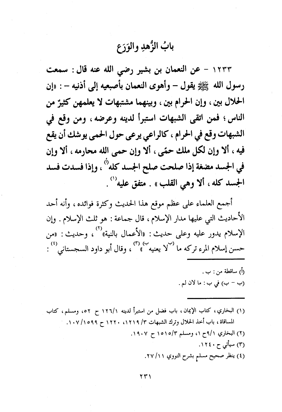 (¬1) البخاري، كتاب الإيمان، باب فضل من استبرأ لدينه 1/ 126 ح 52، ومسلم، كتاب المساقاة، باب أخذ الحلال وترك الشبهات 3/ 1219، 1220 ح 1599/ 107.