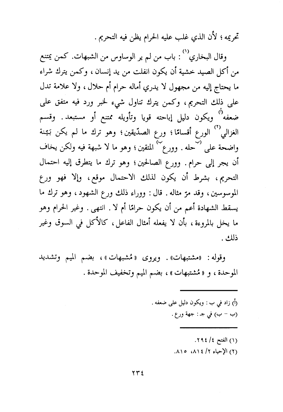 وقال البخاري (¬1): باب من لم ير الوساوس من الشبهات. كمن يمتنع من أكل الصيد خشية أن يكون انفلت من يد إنسان، وكمن يترك شراء ما يحتاج إليه من مجهول لا يدري أماله حرام أم حلال، ولا علامة تدل على ذلك التحريم، وكمن يترك تناول شيء لخبر ورد فيه متفق على ضعفه (أ) ويكون دليل إباحته قويا وتأويله ممتنع أو مستبعد. وقسم الغزالي (¬2) الورع أقسامًا؛ ورع الصدّيقين؛ وهو ترك ما لم يكن بَيّنة واضحة على (ب حله. وورع ب) المتقين؛ وهو ما لا شبهة فيه ولكن يخاف أن يجر إلى حرام. وورع الصالحين، وهو ترك ما يتطرق إليه احتمال التحريم، بشرط أن يكون لذلك الاحتمال موقع، وإلا فهو ورع الموسوسين، وقد مرّ مثاله. قال: ووراء ذلك ورع الشهود، وهو ترك ما يسقط الشهادة أعم من أن يكون حرامًا أم لا. انتهى. وغير الحرام وهو ما يخل بالمروءة، بأن لا يفعله أمثال الفاعل، كالأكل في السوق وغير ذلك.