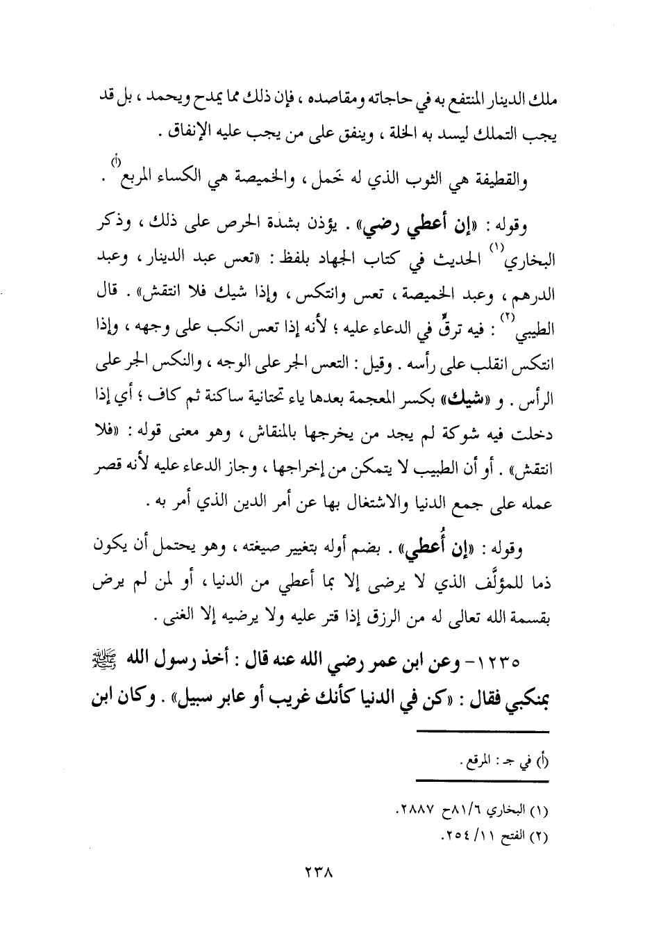 1235 - وعن ابن عمر رضي الله عنه قال: أخذ رسول الله - صلى الله عليه وسلم - بمنكبي فقال: "كن في الدنيا كأنك غريب أو عابر سبيل". وكان ابن