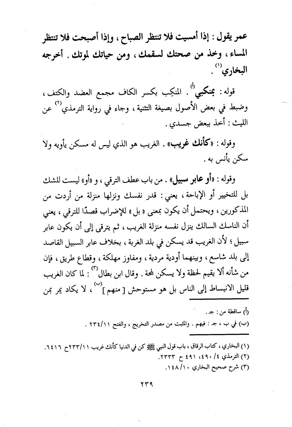 (¬1) البخاري، كتاب الرقاق، باب قول النبي - صلى الله عليه وسلم - كن في الدنيا كأنك غريب 11/ 233 ح 6416.