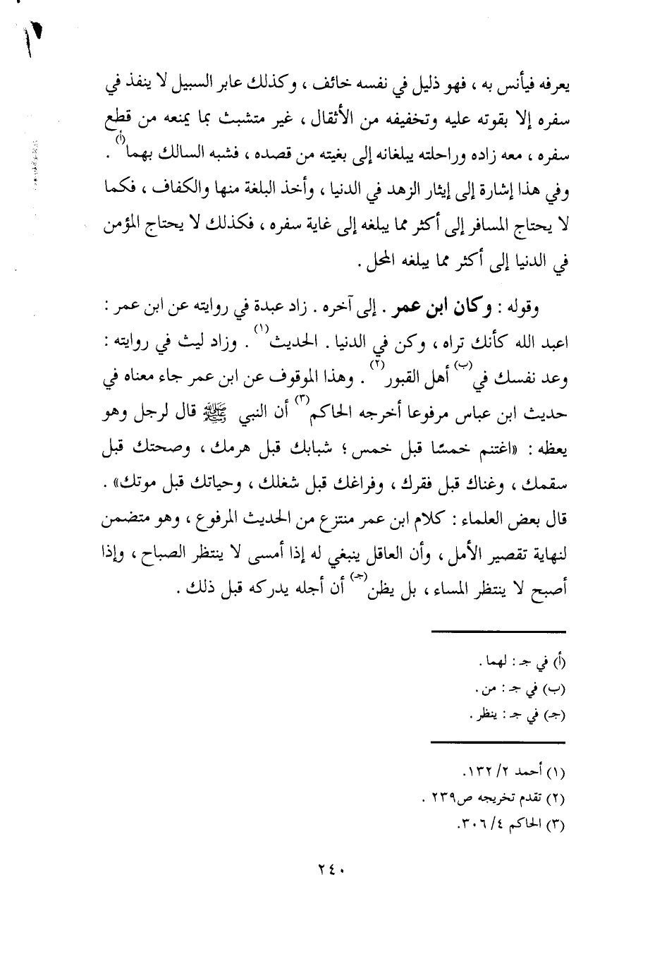 يعرفه فيأنس به، فهو ذليل في نفسه خائف، وكذلك عابر السبيل لا ينفذ في سفره إلا بقوته عليه وتخفيفه من الأثقال، غير متشبث بما يمنعه من قطع سفره، معه زاده وراحلته يبلغانه إلى بغيته من قصده، فشبه السالك بهما (أ). وفي هذا إشارة إلى إيثار الزهد في الدنيا، وأخذ البلغة منها والكفاف، فكما لا يحتاج المسافر إلى أكثر مما يبلغه إلى غاية سفره، فكذلك لا يحتاج المؤمن في الدنيا إلى أكثر مما يبلغه المحل.