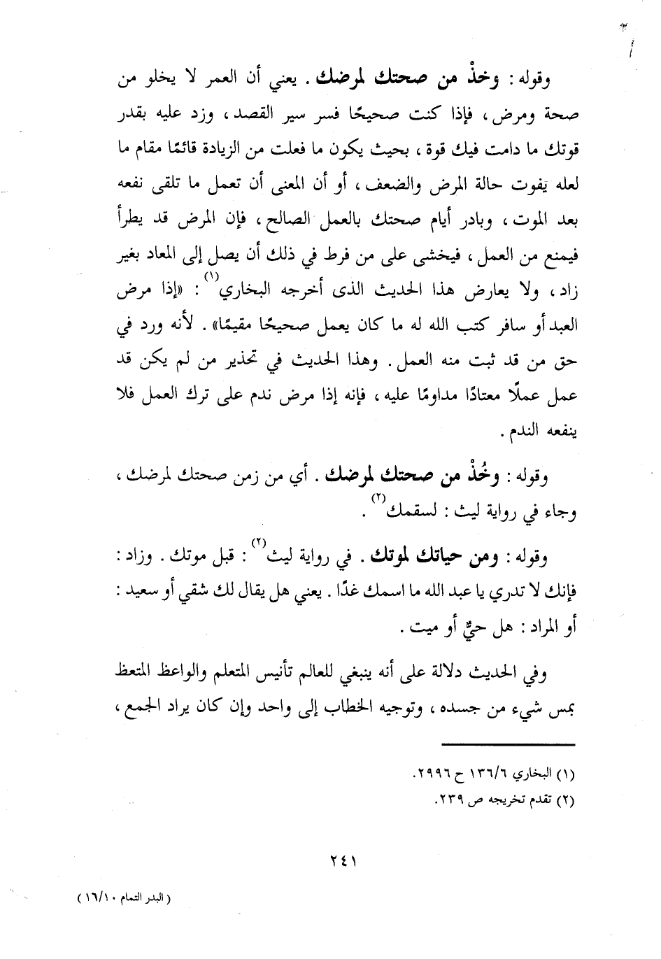 وقوله: وخذْ من صحتك لمرضك. يعني أن العمر لا يخلو من صحة ومرض، فإذا كنت صحيحًا فسر سير القصد، وزد عليه بقدر قوتك ما دامت فيك قوة، بحيث يكون ما فعلت من الزيادة قائمًا مقام ما لعله يفوت حالة المرض والضعف، أو أن المعنى أن تعمل ما تلقى نفعه بعد الموت، وبادر أيام صحتك بالعمل الصالح، فإن المرض قد يطرأ فيمنع من العمل، فيخشى على من فرط في ذلك أن يصل إلى المعاد بغير زاد، ولا يعارض هذا الحديث الذي أخرجه البخاري (¬1): "إذا مرض العبد أو سافر كتب الله له ما كان يعمل صحيحًا مقيمًا". لأنه ورد في حق من قد ثبت منه العمل. وهذا الحديث في تحذير من لم يكن قد عمل عملًا معتادًا مداومًا عليه، فإنه إذا مرض ندم على ترك العمل فلا ينفعه الندم.