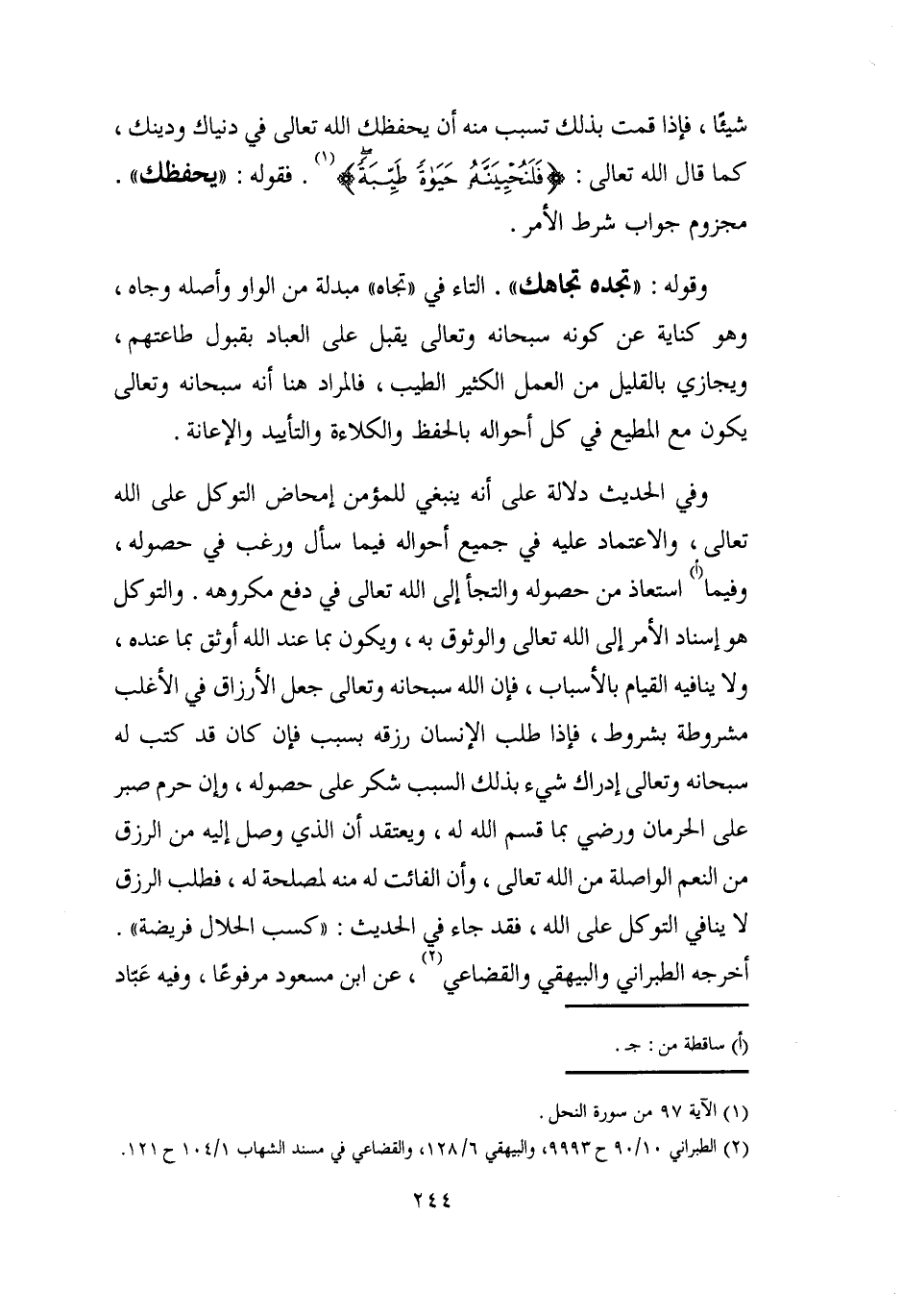 شيئًا، فإذا قمت بذلك تسبب منه أن يحفظك الله تعالى في دنياك ودينك، كما قال الله تعالى: {فَلَنُحْيِيَنَّهُ حَيَاةً طَيِّبَةً} (¬1). فقوله: "يحفظك". مجزوم جواب شرط الأمر.