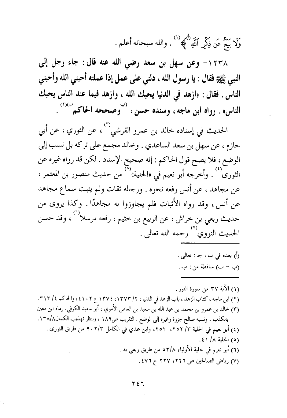 1238 - وعن سهل بن سعد رضي الله عنه قال: جاء رجل إلى النبي - صلى الله عليه وسلم - فقال: يا رسول الله، دلني على عمل إذا عملته أحبني الله وأحبني الناس. فقال: "ازهد في الدنيا يحبك الله، وازهد فيما عند الناس يحبك الناس". رواه ابن ماجه، وسنده حسن، (ب وصححه الحاكم ب) (¬2).