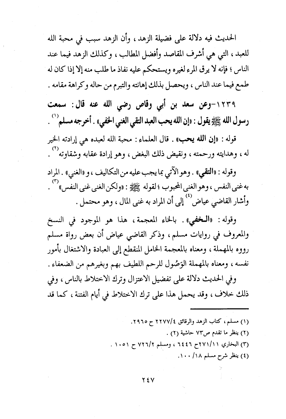 1239 - وعن سعد بن أبي وقاص رضي الله عنه قال: سمعت رسول الله - صلى الله عليه وسلم - يقول: "إن الله يحب العبد التقي الغني الخفي ". أخرجه مسلم (¬1).
