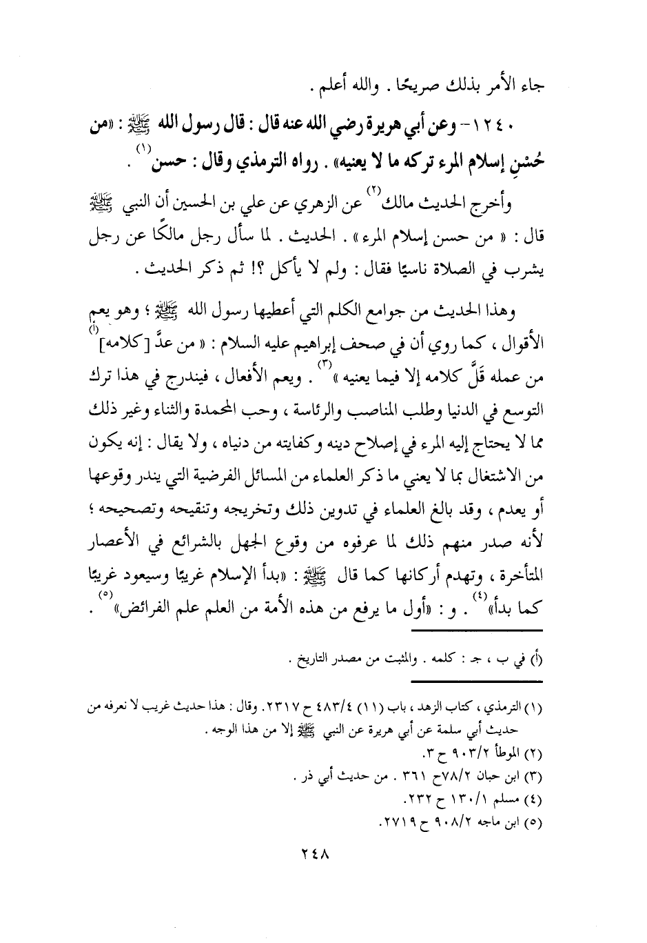وهذا الحديث من جوامع الكلم التي أعطيها رسول الله - صلى الله عليه وسلم -، وهو يعم الأقوال، كما روي أن في صحف إبراهيم - عليه السلام -: "من عدَّ [كلامه] (أ) من عمله قَلَّ كلامه إلا فيما يعنيه" (¬3). ويعم الأفعال، فيندرج في هذا ترك التوسع في الدنيا وطلب المناصب والرئاسة، وحب المحمدة والثناء وغير ذلك مما لا يحتاج إليه المرء في إصلاح دينه وكفايته من دنياه، ولا يقال: إنه يكون من الاشتغال بما لا يعني ما ذكر العلماء من المسائل الفرضية التي يندر وقوعها أو يعدم، وقد بالغ العلماء في تدوين ذلك وتخريجه وتنقيحه وتصحيحه؛ لأنه صدر منهم ذلك لما عرفوه من وقوع الجهل بالشرائع في الأعصار المتأخرة، وتهدم أركانها كما قال - صلى الله عليه وسلم -: "بدأ الإسلام غريبًا وسيعود غريبًا كما بدأ" (¬4). و: "أول ما يرفع من هذه الأمة من العلم علم الفرائض" (¬5).
