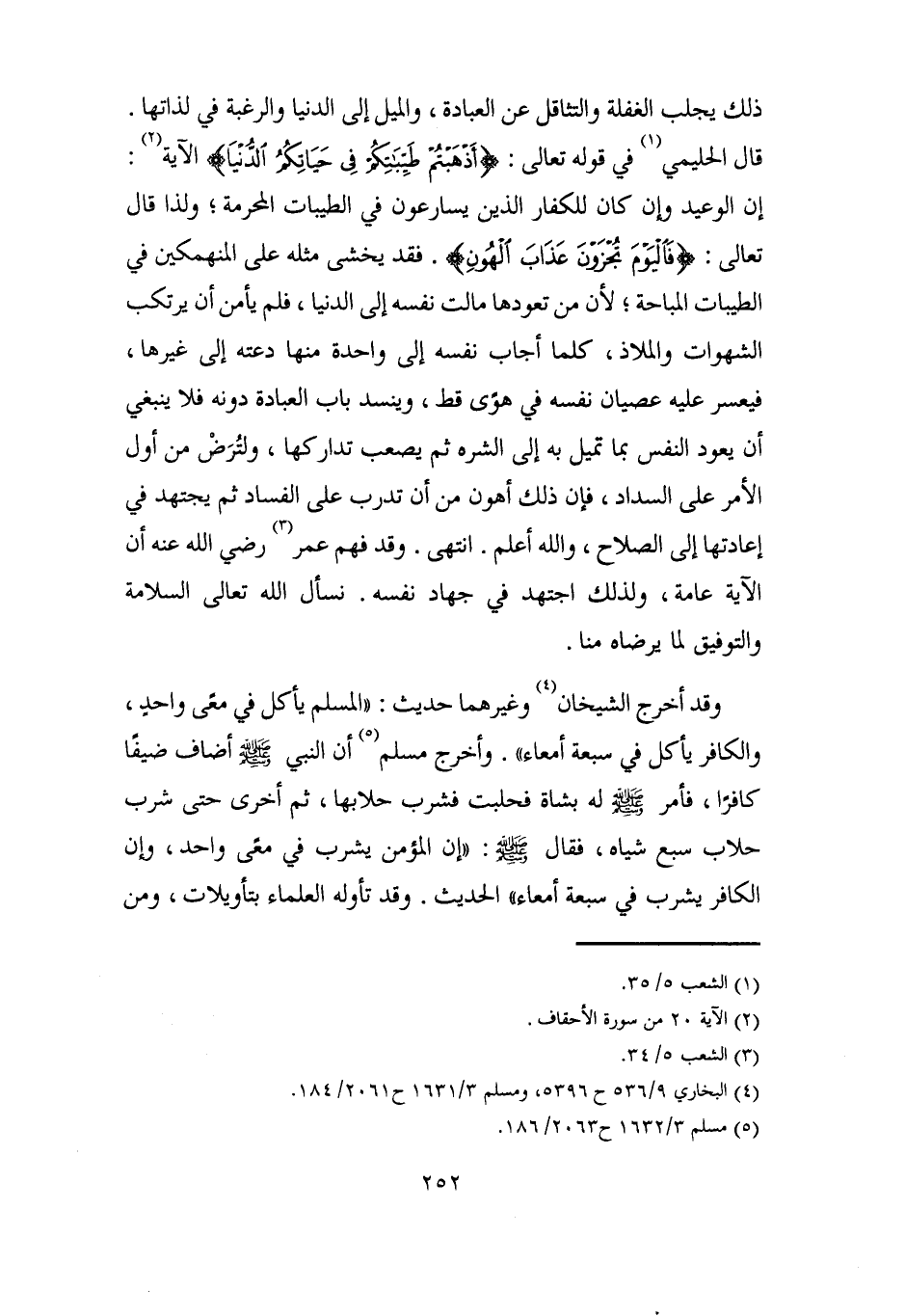 وقد أخرج الشيخان (¬4) وغيرهما حديث: "المسلم يأكل في معًى واحدٍ، والكافر يأكل في سبعة أمعاء". وأخرج مسلم (¬5) أن النبي - صلى الله عليه وسلم - أضاف ضيفًا كافرًا، فأمر - صلى الله عليه وسلم - له بشاة فحلبت فشرب حلابها، ثم أخرى حتى شرب حلاب سبع شياه، فقال - صلى الله عليه وسلم -: "إن المؤمن يشرب في معًى واحد، وإن الكافر يشرب في سبعة أمعاء" الحديث. وقد تأوله العلماء بتأويلات، ومن