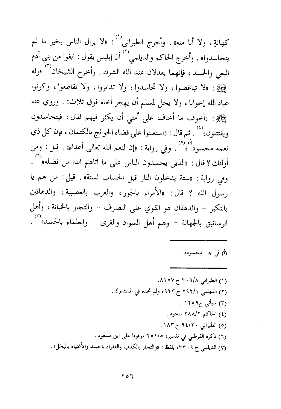 كهانةٍ، ولا أنا منه". وأخرج الطبراني (¬1): "لا يزال الناس بخير ما لم يتحاسدوا". وأخرج الحاكم والديلمي (¬2) أن إبليس يقول: ابغوا من بني آدم البغي والحسد، فإنهما يعدلان عند الله الشرك. وأخرج الشيخان (¬3) قوله - صلى الله عليه وسلم -: "لا تباغضوا، ولا تحاسدوا، ولا تدابروا، ولا تقاطعوا، وكونوا عباد الله إخوانا، ولا يحل لسلم أن يهجر أخاه فوق ثلاث"، وروي عنه - صلى الله عليه وسلم -: "أخوف ما أخاف على أمتي أن يكثر فيهم المال، فيتحاسدون ويقتتلون" (¬4). ثم قال: "استعينوا على قضاء الحوائج بالكتمان، فإن كل ذي نعمة محسود (أ) " (¬5). وفي رواية: "إن لنعم الله تعالى أعداء". قيل: ومن أولئك؟ قال: "الذين يحسدون الناس على ما آتاهم الله من فضله" (¬6). وفي رواية: "ستة يدخلون النار قبل الحساب لستة". قيل: من هم يا رسول الله؟ قال: "الأمراء بالجور، والعرب بالعصبية، والدهاقين بالتكبر -والدهقان هو القوي على التصرف- والتجار بالخيانة، وأهل الرساتيق بالجهالة -وهم أهل السواد والقرى- والعلماء بالحسد" (¬7).