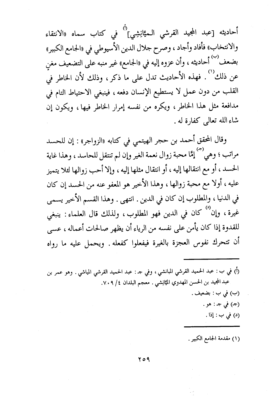 أحاديثه [عبد المجيد القرشي الميَّانِشِي] (أ) في كتاب سماه "الانتقاء والانتخاب" فأفاد وأجاد، وصرح جلال الدين الأسيوطي في "الجامع الكبير" بضعف (ب) أحاديثه، وأن عزوه إليه في "الجامع" غير منبه على التضعيف مغنٍ عن ذلك (¬1). فهذه الأحاديث تدل على ما ذكر، وذلك لأن الخاطر في القلب من دون عمل لا يستطيع الإنسان دفعه، فينبغي الاحتياط التام في مدافعة مثل هذا الخاطر، ويكره من نفسه إمرار الخاطر فيها، ويكون إن شاء الله تعالى كفارة له.