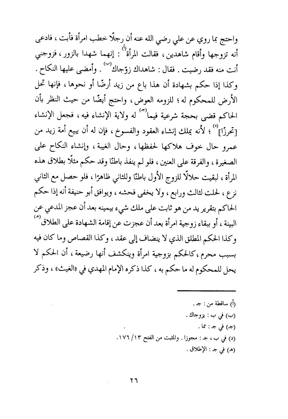 واحتج بما روي عن علي رضي الله عنه أن رجلًا خطب امرأة فأبت، فادعى أنه تزوجها وأقام شاهدين، فقالت المرأة (أ): إنهما شهدا بالزور، فزوجني أنت منه فقد رضيت. فقال: شاهداك زوّجاك (ب). وأمضى عليها النكاح. وكذا إذا حكم بشهادة أن هذا باع من زيد أرضًا أو نحوها، فإنها تحل الأرض للمحكوم له، للزومه العوض، واحتج أيضًا من حيث النظر بأن الحاكم قضى بحجة شرعية فيما (جـ) له ولاية الإنشاء فيه، فجعل الإنشاء [تحرزًا] (د)؛ لأنه يملك إنشاء العقود والفسوخ، فإن له أن يبيع أمة زيد من عمرو حال خوف هلاكها لحفظها، وحال الغيبة، وإنشاء النكاح على الصغيرة، والفرقة على العنين، فلو لم ينفذ باطنًا وقد حكم مثلًا بطلاق هذه المرأة، لبقيت حلالًا للزوج الأول باطنًا وللثاني ظاهرًا، فلو حصل مع الثاني نزع، لحلت لثالث ورابع، ولا يخفى فحشه، ويوافق أبو حنيفة أنه إذا حكم الحاكم بتقرير يد من هو ثابت على ملك شيء بيمينه بعدأن عجز المدعي عن البينة، أو ببقاء زوجية امرأة بعد أن عجزت عن إقامة الشهادة على الطلاق (هـ) وكذا الحكم المطلق الذي لا ينضاف إلى عقد، وكذا القصاص وما كان فيه بسبب محرم، كالحكم بزوجية امرأة وينكشف أنها رضيعة، أن الحكم لا يحل للمحكوم له ما حكم به، كذا ذكره الإِمام المهدي في "الغيث"، وذكر