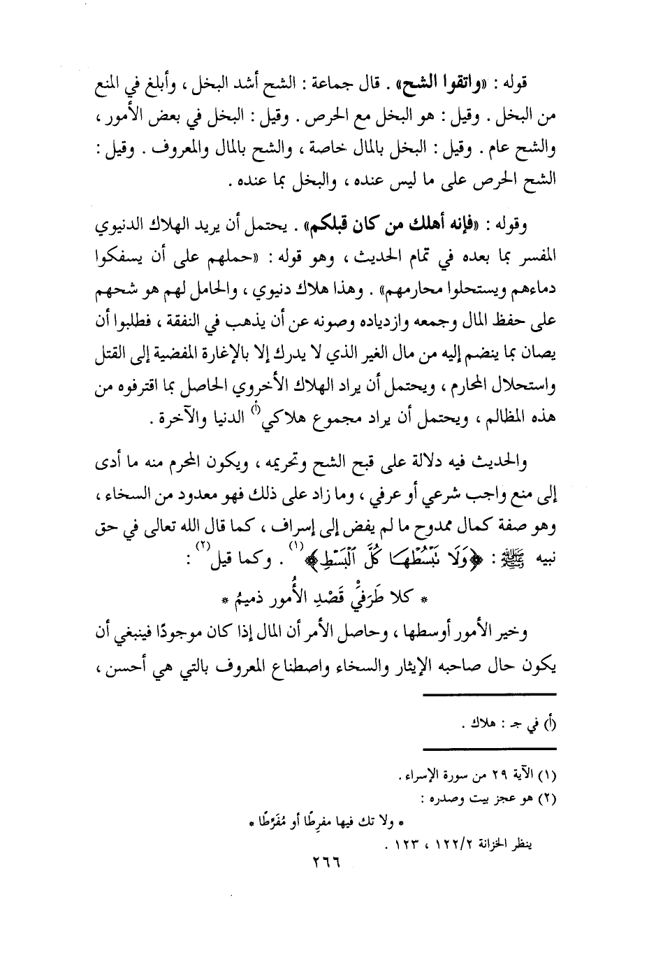 والحديث فيه دلالة على قبح الشح وتحريمه، ويكون المحرم منه ما أدى إلى منع واجب شرعي أو عرفي، وما زاد على ذلك فهو معدود من السخاء، وهو صفة كمال ممدوح ما لم يفض إلى إسراف، كما قال الله تعالى في حق نبيه - صلى الله عليه وسلم -: {وَلَا تَبْسُطْهَا كُلَّ الْبَسْطِ} (¬1). وكما قيل (¬2):