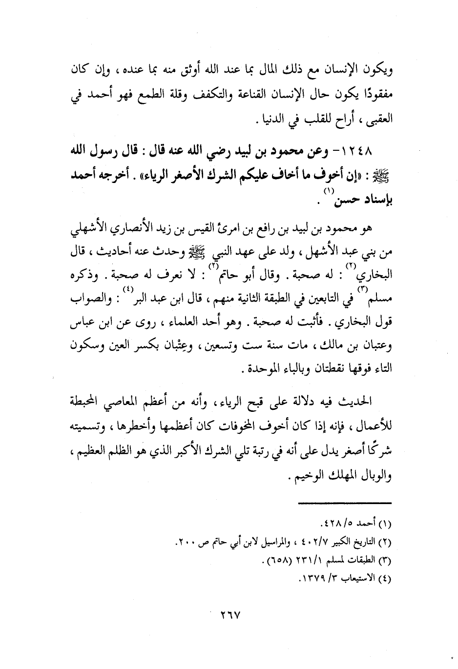 1248 - وعن محمود بن لبيد رضي الله عنه قال: قال رسول الله - صلى الله عليه وسلم -: "إن أخوف ما أخاف عليكم الشرك الأصغر الرياء". أخرجه أحمد بإسناد حسن (¬1).