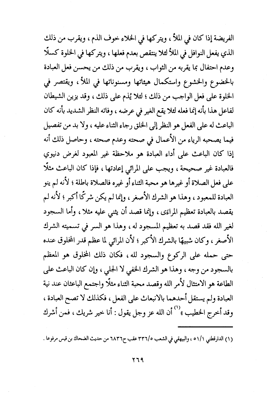 الفريضة إذا كان في الملأ، ويتركها في الخلاء خوف الذم، ويقرب من ذلك الذي يفعل النوافل في الملأ لئلا ينتقص بعدم فعلها، ويتركها في الخلوة كسلًا وعدم احتفال بما يقربه من الثواب، ويقرب من ذلك من يحسن فعل العبادة بالخضوع والخشوع واستكمال هيئاتها ومسنوناتها في الملأ، ويقتصر في الخلوة على فعل الواجب من ذلك؛ لئلا يُذم على ذلك، وقد يزين الشيطان لفاعل هذا بأنه إنما فعله لئلا يقع الغير في عرضه، وفاته النظر الشديد بأنه كان الباعث له على الفعل هو النظر إلى الخلق رجاء الثناء عليه، ولا بد من تفصيل فيما يصحبه الرياء من الأعمال في صحته وعدم صحته، وحاصل ذلك أنه إذا كان الباعث على أداء العبادة هو ملاحظة غير المعبود لغرض دنيوي فالعبادة غير صحيحة، ويجب على المرائي إعادتها، فإذا كان الباعث مثلًا على فعل الصلاة أو غيرها هو محبة الثناء أو غيره فالصلاة باطلة؛ لأنه لم ينو العبادة للمعبود، وهذا هو الشرك الأصغر، وإنما لم يكن شركًا أكبر؛ لأنه لم يقصد بالعبادة تعظيم المراءَى، وإنما قصد أن يثني عليه مثلًا، وأما السجود لغير الله فقد قصد به تعظيم المسجود له، وهذا هو السر في تسميته الشرك الأصغر، وكان شبيهًا بالشرك الأكبر؛ لأن المرائي لما عظم قدر المخلوق عنده حتى حمله على الركوع والسجود لله، فكان ذلك المخلوق هو المعظم بالسجود من وجه، وهذا هو الشرك الخفي لا الجلي، وإن كان الباعث على الطاعة هو الامتثال لأمر الله وقصد محبة الثناء مثلًا واجتمع الباعثان عند نية العبادة ولم يستقل أحدهما بالانبعاث على الفعل، فكذلك لا تصح العبادة، وقد أخرج الخطيب" (¬1) أن الله عزَّ وجلَّ يقول: أنا خير شريك، فمن أشرك