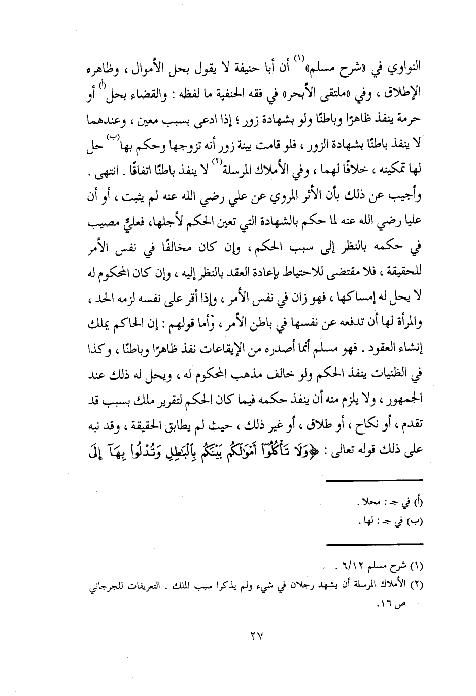 النواوي في "شرح مسلم" (¬1) أن أبا حنيفة لا يقول بحل الأموال، وظاهره الإطلاق، وفي "ملتقى الأبحر" في فقه الحنفية ما لفظه: والقضاء بحل (أ) أو حرمة ينفذ ظاهرًا وباطنًا ولو بشهادة زور؛ إذا ادعى بسبب معين، وعندهما لا ينفذ باطنًا بشهادة الزور، فلو قامت بينة زور أنه تزوجها وحكم بها (ب) حل لها تمكينه، خلافًا لهما، وفي الأملاك المرسلة (¬2) لا ينفذ باطنًا اتفاقًا. انتهى. وأجيب عن ذلك بأن الأثر المروي عن علي رضي الله عنه لم يثبت، أو أن عليا رضي الله عنه لما حكم بالشهادة التي تعين الحكم لأجلها، فعليٌّ مصيب في حكمه بالنظر إلى سبب الحكم، وإن كان مخالفًا في نفس الأمر للحقيقة، فلا مقتضى للاحتياط بإعادة العقد بالنظر إليه، وإن كان المحكوم له لا يحل له إمساكها، فهو زان في نفس الأمر، وإذا أقر على نفسه لزمه الحد، والمرأة لها أن تدفعه عن نفسها في باطن الأمر، وأما قولهم: إن الحاكم يملك إنشاء العقود. فهو مسلم أنما أصدره من الإيقاعات نفذ ظاهرًا وباطنًا، وكذا في الظنيات ينفذ الحكم ولو خالف مذهب المحكوم له، ويحل له ذلك عند الجمهور، ولا يلزم منه أن ينفذ حكمه فيما كان الحكم لتقرير ملك بسبب قد تقدم، أو نكاح، أو طلاق، أو غير ذلك، حيث لم يطابق الحقيقة، وقد نبه على ذلك قوله تعالى: {وَلَا تَأْكُلُوا أَمْوَالَكُمْ بَيْنَكُمْ بِالْبَاطِلِ وَتُدْلُوا بِهَا إِلَى