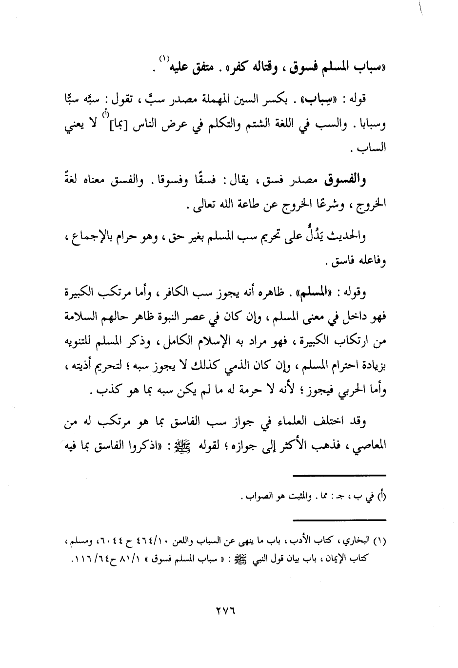(¬1) البخاري، كتاب الأدب، باب ما ينهى عن السباب واللعن 10/ 464 ح 6044، ومسلم، كتاب الإيمان، باب بيان قول النبي - صلى الله عليه وسلم -: "سباب المسلم فسوق" 1/ 81 ح 64/ 116.