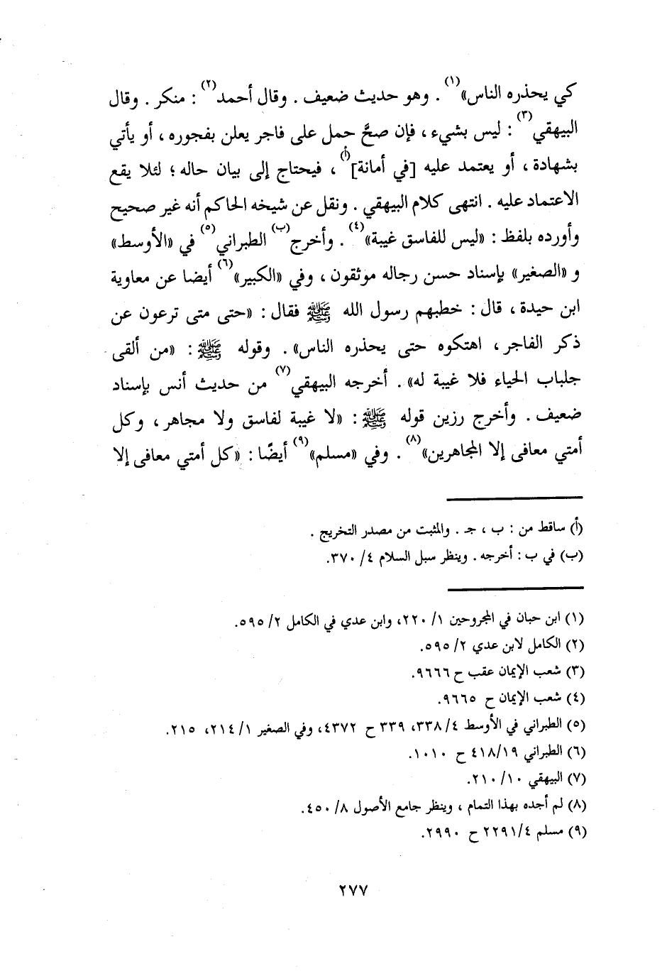كي يحذره الناس" (¬1). وهو حديث ضعيف. وقال أحمد (¬2): منكر. وقال البيهقي (¬3): ليس بشيء، فإن صحَّ حمل على فاجر يعلن بفجوره، أو يأتي بشهادة، أو يعتمد عليه [في أمانة] (أ)، فيحتاج إلى بيان حاله؛ لئلا يقع الاعتماد عليه. انتهى كلام البيهقي. ونقل عن شيخه الحاكم أنه غير صحيح وأورده بلفظ: "ليس للفاسق غيبة" (¬4). وأخرج (ب) الطبراني (¬5) في "الأوسط " و "الصغير" بإسناد حسن رجاله موثقون، وفي "الكبير" (¬6) أيضًا عن معاوية بن حيدة، قال: خطبهم رسول الله - صلى الله عليه وسلم - فقال: "حتى متى ترعون عن ذكر الفاجر، اهتكوه حتى يحذره الناس". وقوله - صلى الله عليه وسلم -: "من ألقى جلباب الحياء فلا غيبة له". أخرجه البيهقي (¬7) من حديث أنس بإسناد ضعيف. وأخرج رزين قوله - صلى الله عليه وسلم -: "لا غيبة لفاسق ولا مجاهر، وكل أمتي معافى إلا المجاهرين" (¬8). وفي "مسلم" (¬9) أيضًا: "كل أمتي معافى إلا