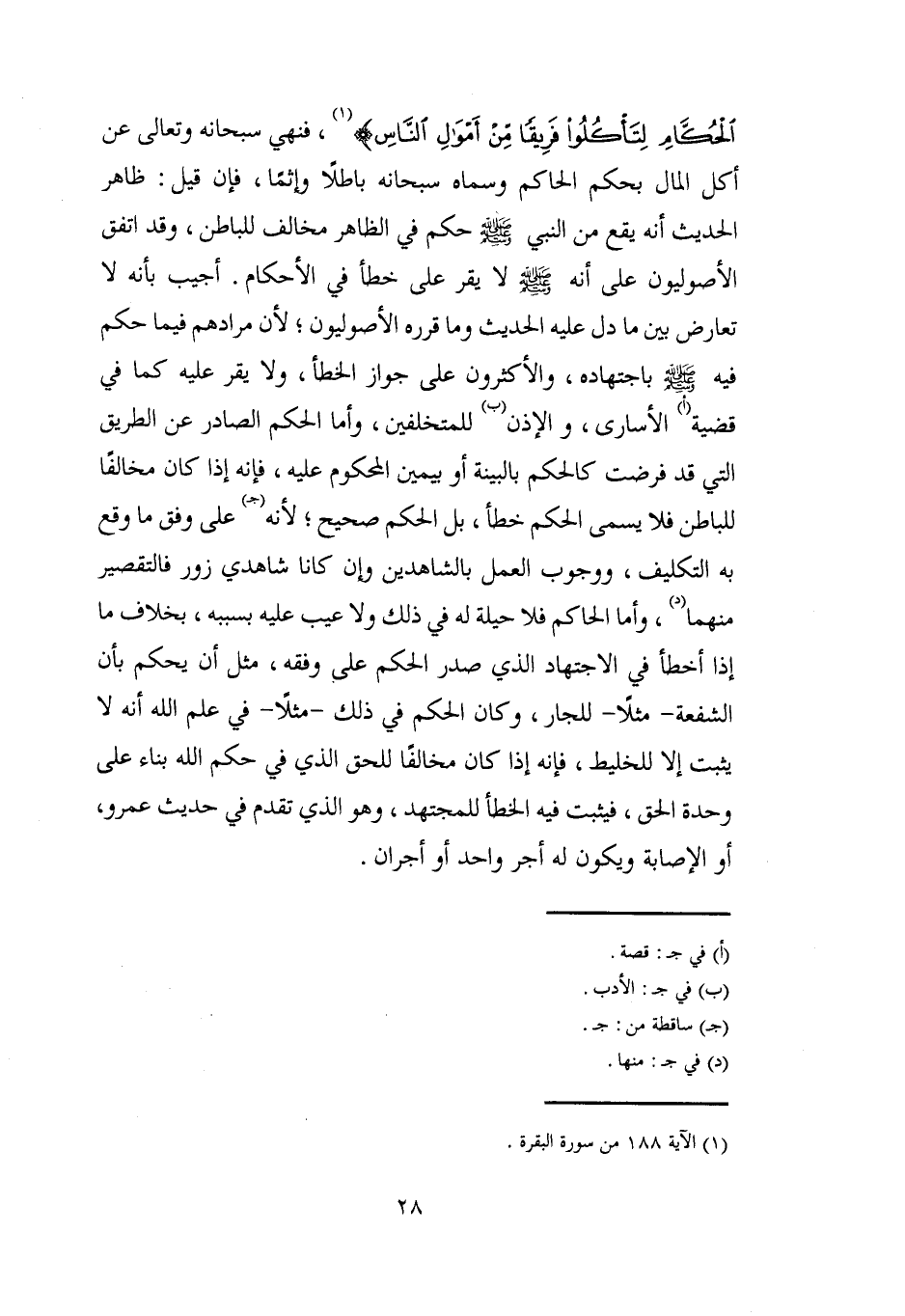 الْحُكَّامِ لِتَأْكُلُوا فَرِيقًا مِنْ أَمْوَالِ النَّاسِ} (¬1)، فنهي سبحانه وتعالى عن أكل المال بحكم الحاكم وسماه سبحانه باطلًا وإثمًا، فإن قيل: ظاهر الحديث أنه يقع من النبي - صلى الله عليه وسلم - حكم في الظاهر مخالف للباطن، وقد اتفق الأصوليون على أنه - صلى الله عليه وسلم - لا يقر على خطأ في الأحكام. أجيب بأنه لا تعارض بين ما دل عليه الحديث وما قرره الأصوليون؛ لأن مرادهم فيما حكم فيه - صلى الله عليه وسلم - باجتهاده، والأكثرون على جواز الخطأ، ولا يقر عليه كما في قضية (أ) الأسارى، والإذن (ب) للمتخلفين، وأما الحكم الصادر عن الطريق التي قد فرضت كالحكم بالبينة أو بيمين المحكوم عليه، فإنه إذا كان مخالفًا للباطن فلا يسمى الحكم خطأ، بل الحكم صحيح؛ لأنه (جـ) على وفق ما وقع به التكليف، ووجوب العمل بالشاهدين وإن كانا شاهدي زور فالتقصير منهما (د)، وأما الحاكم فلا حيلة له في ذلك ولا عيب عليه بسببه، بخلاف ما إذا أخطأ في الاجتهاد الذي صدر الحكم علي وفقه، مثل أن يحكم بأن الشفعة -مثلًا- للجار، وكان الحكم في ذلك -مثلًا- في علم الله أنه لا يثبت إلا للخليط، فإنه إذا كان مخالفًا للحق الذي في حكم الله بناء على وحدة الحق، فيثبت فيه الخطأ للمجتهد، وهو الذي تقدم في حديث عمرو، أو الإصابة ويكون له أجر واحد أو أجران.