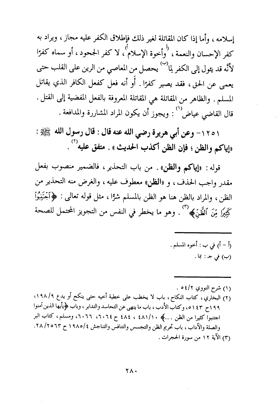 (¬2) البخاري، كتاب النكاح، باب لا يخطب على خطبة أخيه حتى ينكح أو يدع 9/ 198، 199 ح 5143، وكتاب الأدب، باب ما ينهى عن التحاسد والتدابر، وباب {يَا أَيُّهَا الَّذِينَ آمَنُوا اجْتَنِبُوا كَثِيرًا مِنَ الظَّنِّ. . .} 10/ 481، 484 ح 6064، 6066، ومسلم، كتاب البر والصلة والآداب، باب تحريم الظن والتجسس والتنافس والتناجش 4/ 1985 ح 2563/ 28.