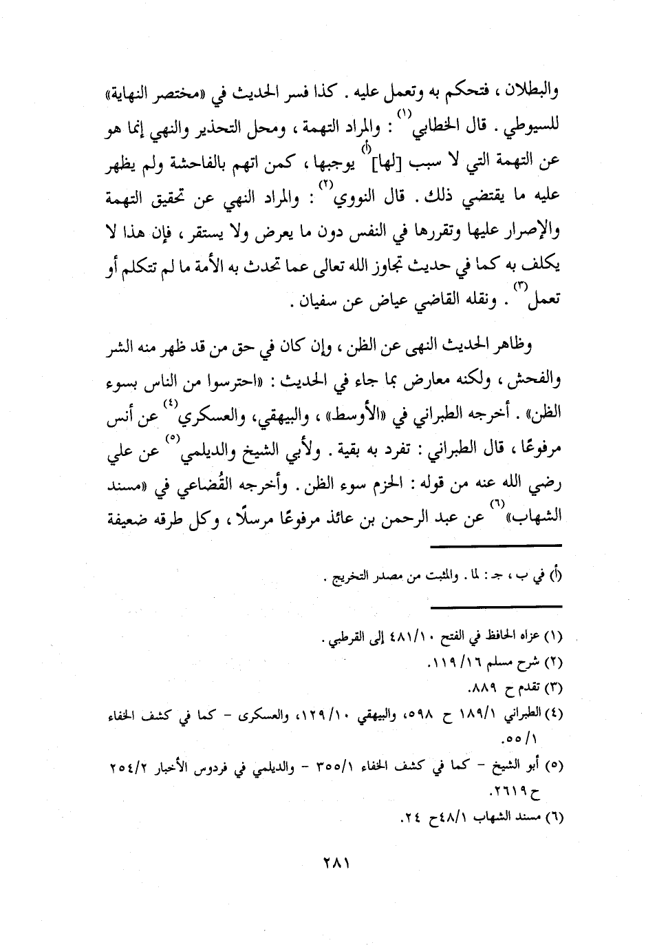والبطلان، فتحكم به وتعمل عليه. كذا فسر الحديث في "مختصر النهاية" للسيوطي. قال الخطابي (¬1): والمراد التهمة، ومحل التحذير والنهي إنما هو عن التهمة التي لا سبب [لها] (أ) يوجبها، كمن اتهم بالفاحشة ولم يظهر عليه ما يقتضي ذلك. قال النووي (¬2): والمراد النهي عن تحقيق التهمة والإصرار عليها وتقررها في النفس دون ما يعرض ولا يستقر، فإن هذا لا يكلف به كما في حديث تجاوز الله تعالى عما تحدث به الأمة ما لم تتكلم أو تعمل (¬3). ونقله القاضي عياض عن سفيان.
