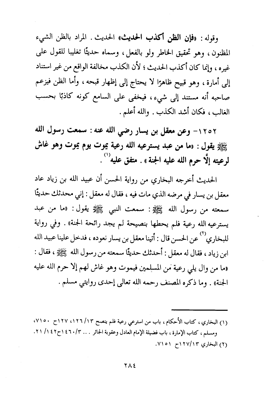 1252 - وعن معقل بن يسار رضي الله عنه: سمعت رسول الله - صلى الله عليه وسلم - يقول: "ما من عبد يسترعيه الله رعية يموت يوم يموت وهو غاش لرعيته إلَّا حرم الله عليه الجنة". متفق عليه (¬1).