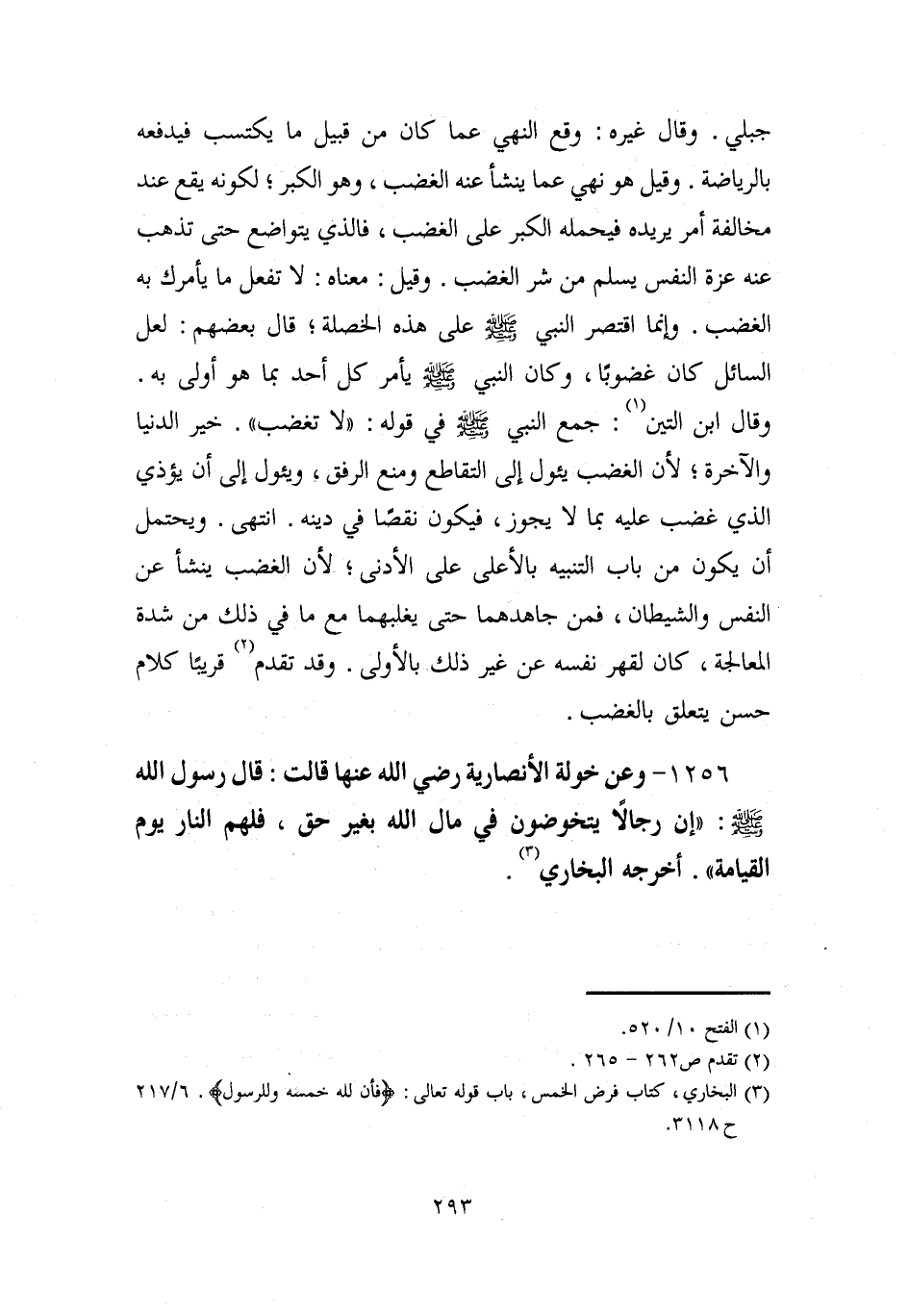 1256 - وعن خولة الأنصارية رضي الله عنها قالت: قال رسول الله - صلى الله عليه وسلم -: "إن رجالًا يتخوضون في مال الله بغير حق، فلهم النار يوم القيامة". أخرجه البخاري (¬3).