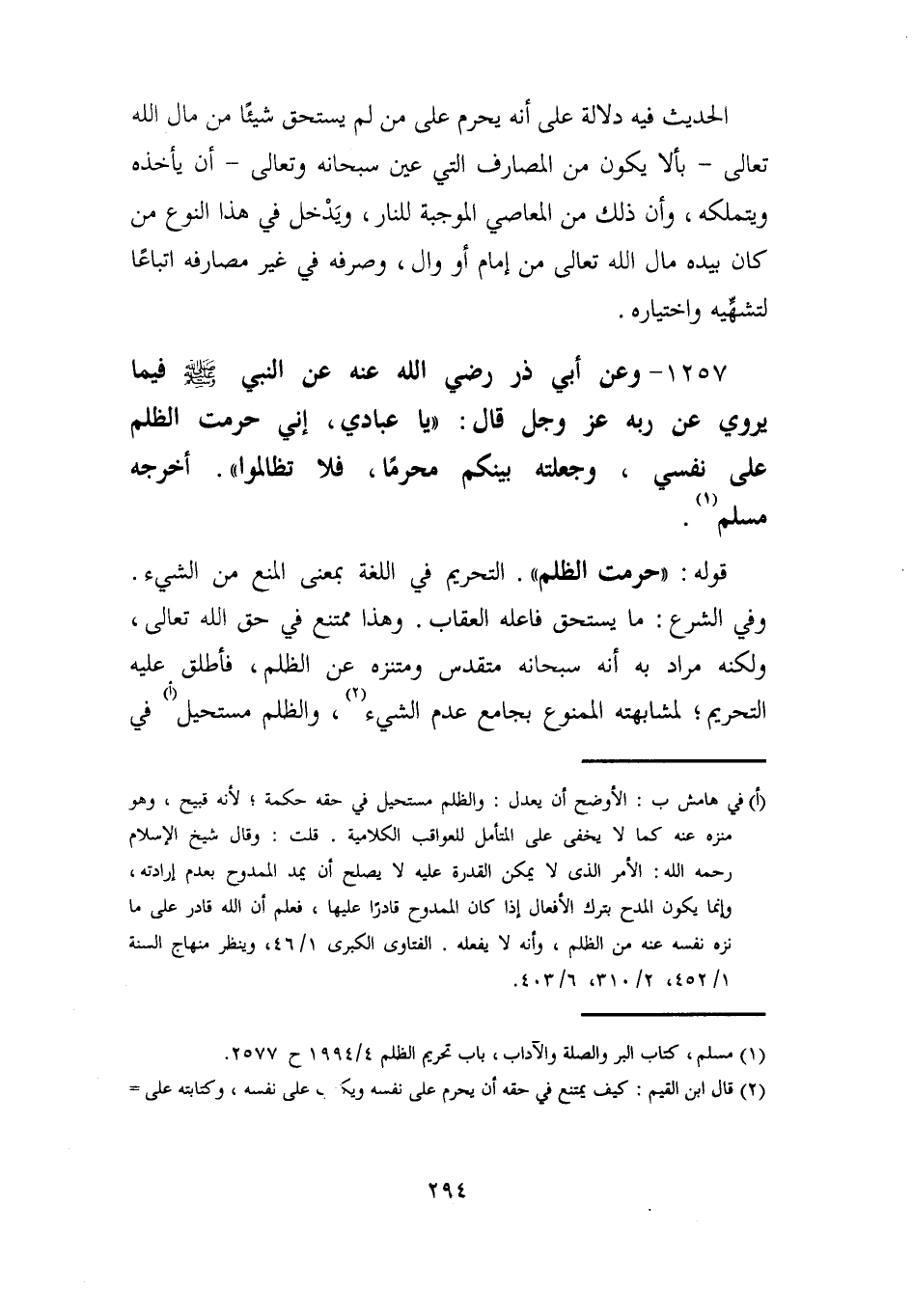 1257 - وعن أبي ذر رضي الله عنه عن النبي - صلى الله عليه وسلم - فيما يروي عن ربه عزَّ وجلَّ قال: "يا عبادي، إني حرمت الظلم على نفسي، وجعلته بينكم محرمًا، فلا تظالموا". أخرجه مسلم (¬1).