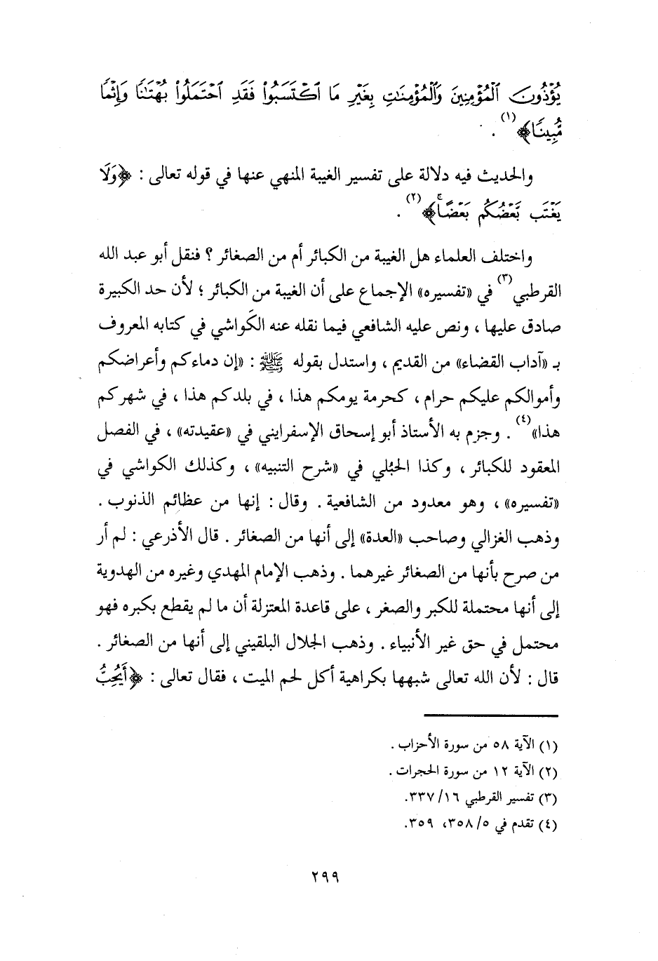 واختلف العلماء هل الغيبة من الكبائر أم من الصغائر؟ فنقل أبو عبد الله القرطبي (¬3) في "تفسيره" الإجماع على أن الغيبة من الكبائر؛ لأن حد الكبيرة صادق عليها، ونص عليه الشافعي فيما نقله عنه الكَواشي في كتابه المعروف بـ "آداب القضاء" من القديم، واستدل بقوله - صلى الله عليه وسلم -: "إن دماءكم وأعراضكم وأموالكم عليكم حرام، كحرمة يومكم هذا، في بلدكم هذا، في شهركم هذا" (¬4). وجزم به الأستاذ أبو إسحاق الإسفرايني في "عقيدته"، في الفصل المعقود للكبائر، وكذا الحبُلي في "شرح التنبيه"، وكذلك الكواشي في "تفسيره"، وهو معدود من الشافعية. وقال: إنها من عظائم الذنوب. وذهب الغزالي وصاحب "العدة" إلى أنها من الصغائر. قال الأذرعي: لم أر من صرح بأنها من الصغائر غيرهما. وذهب الإمام المهدي وغيره من الهدوية إلى أنها محتملة للكبر والصغر، على قاعدة المعتزلة أن ما لم يقطع بكبره فهو محتمل في حق غير الأنبياء. وذهب الجلال البلقيني إلى أنها من الصغائر. قال: لأن الله تعالى شبهها بكراهية أكل لحم الميت، فقال تعالى: {أَيُحِبُّ