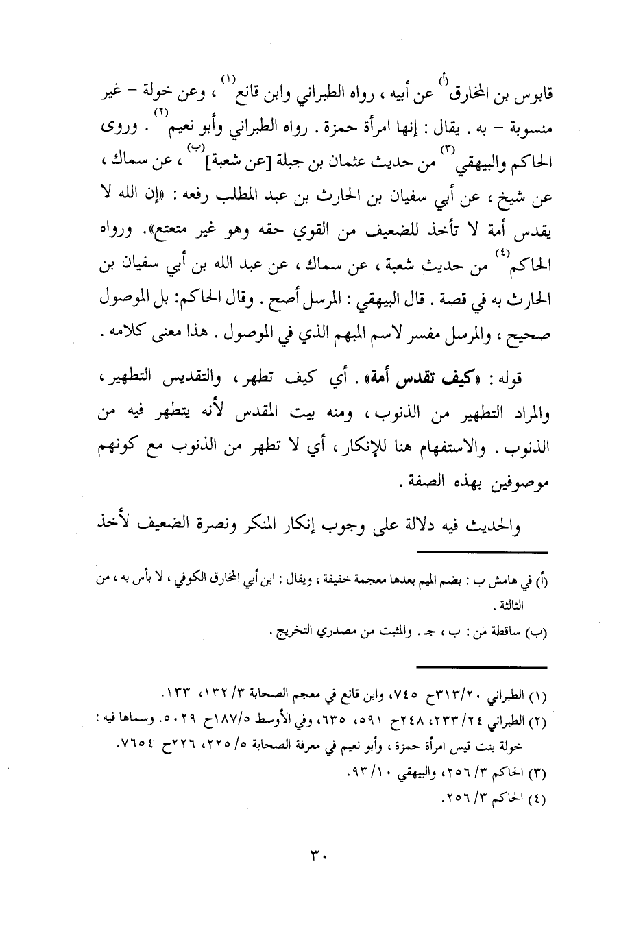 قابوس بن المخارق (ب) عن أبيه، رواه الطبراني وابن قانع (¬1)، وعن خولة -غير منسوبة- به. يقال: إنها امرأة حمزة. رواه الطبراني وأبو نعيم (¬2). وروى الحاكم والبيهقي (¬3) من حديث عثمان بن جبلة [عن شعبة] (ب)، عن سماك، عن شيخ، عن أبي سفيان بن الحارث بن عبد المطلب رفعه: "إن الله لا يقدس أمة لا تأخذ للضعيف من القوي حقه وهو غير متعتع". ورواه الحاكم (¬4) من حديث شعبة، عن سماك، عن عبد الله بن أبي سفيان بن الحارث به في قصة. قال البيهقي: المرسل أصح. وقال الحاكم: بل الموصول صحيح، والمرسل مفسر لاسم المبهم الذي في الموصول. هذا معنى كلامه.