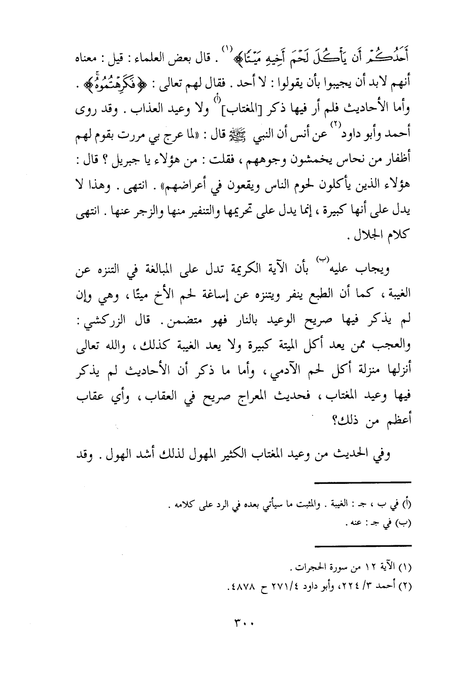 ويجاب عليه (ب) بأن الآية الكريمة تدل على المبالغة في التنزه عن الغيبة، كما أن الطبع ينفر ويتنزه عن إساغة لحم الأخ ميتًا، وهي وإن لم يذكر فيها صريح الوعيد بالنار فهو متضمن. قال الزركشي: والعجب ممن يعد أكل الميتة كبيرة ولا يعد الغيبة كذلك، والله تعالى أنزلها منزلة أكل لحم الآدمي، وأما ما ذكر أن الأحاديث لم يذكر فيها وعيد المغتاب، فحديث المعراج صريح في العقاب، وأي عقاب أعظم من ذلك؟.