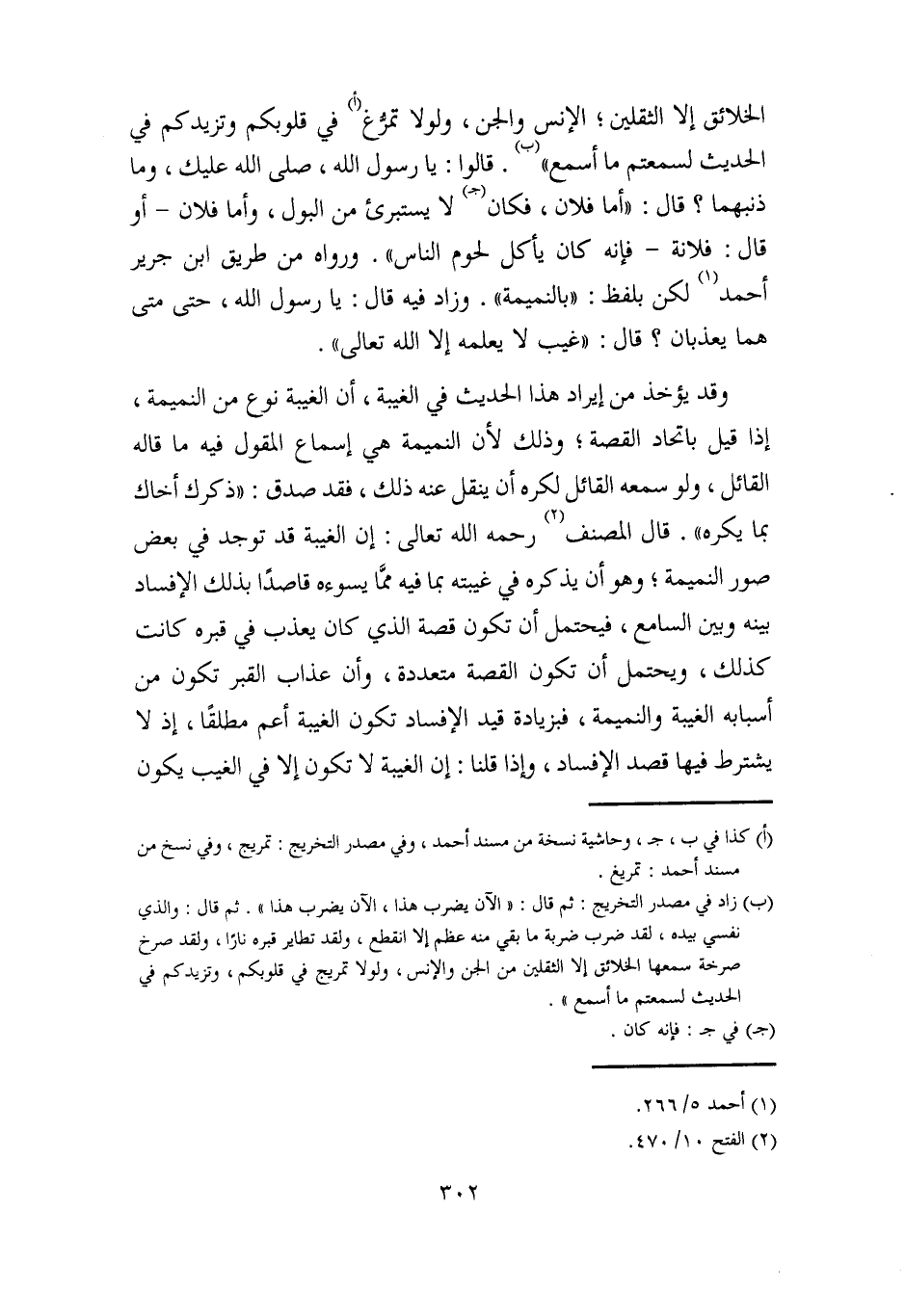 الخلائق إلا الثقلين؛ الإنس والجن، ولولا تمرُّغ (أ) في قلوبكم وتزيدكم في الحديث لسمعتم ما أسمع" (ب). قالوا: يا رسول الله، صلى الله عليك، وما ذنبهما؟ قال: "أما فلان، فكان (جـ) لا يستبرئ من البول، وأما فلان -أو قال: فلانة- فإنه كان يأكل لحوم الناس". ورواه من طريق ابن جرير أحمد (¬1) لكن بلفظ: "بالنميمة". وزاد فيه قال: يا رسول الله، حتى متى هما يعذبان؟ قال: "غيب لا يعلمه إلا الله تعالى".