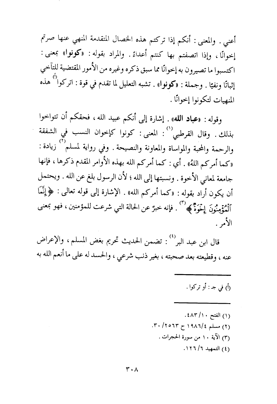 وقوله: "عباد الله". إشارة إلى أنكم عبيد الله، فحقكم أن تتواخوا بذلك. وقال القرطبي (¬1): المعنى: كونوا كإخوان النسب في الشفقة والرحمة والمحبة والمواساة والعاونة والنصيحة. وفي رواية لمسلم (¬2) زيادة: "كما أمركم اللهُ". أي: كما أمركم الله بهذه الأوامر المقدم ذكرها، فإنها جامعة لعاني الأخوة. ونسبتها إلى الله؛ لأن الرسول بلغ عن الله. ويحتمل أن يكون أراد بقوله: "كما أمركم الله". الإشارة إلى قوله تعالى: {إِنَّمَا الْمُؤْمِنُونَ إِخْوَةٌ} (¬3). فإنه خبرٌ عن الحالة التي شرعت للمؤمنين، فهو بمعنى الأمر.