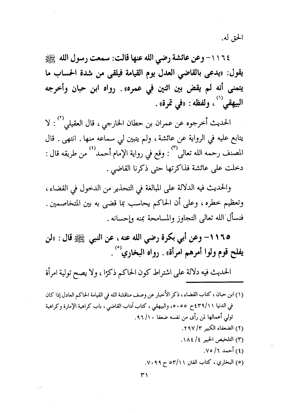 1164 - وعن عائشة رضي الله عنها قالت: سمعت رسول الله - صلى الله عليه وسلم - يقول. "يدعى بالقاضي العدل يوم القيامة فيلقى من شدة الحساب ما يتمنى أنه لم يقض بين اثنين في عمره". رواه ابن حبان وأخرجه البيهقي (¬1)، ولفظه: "في تمرة".